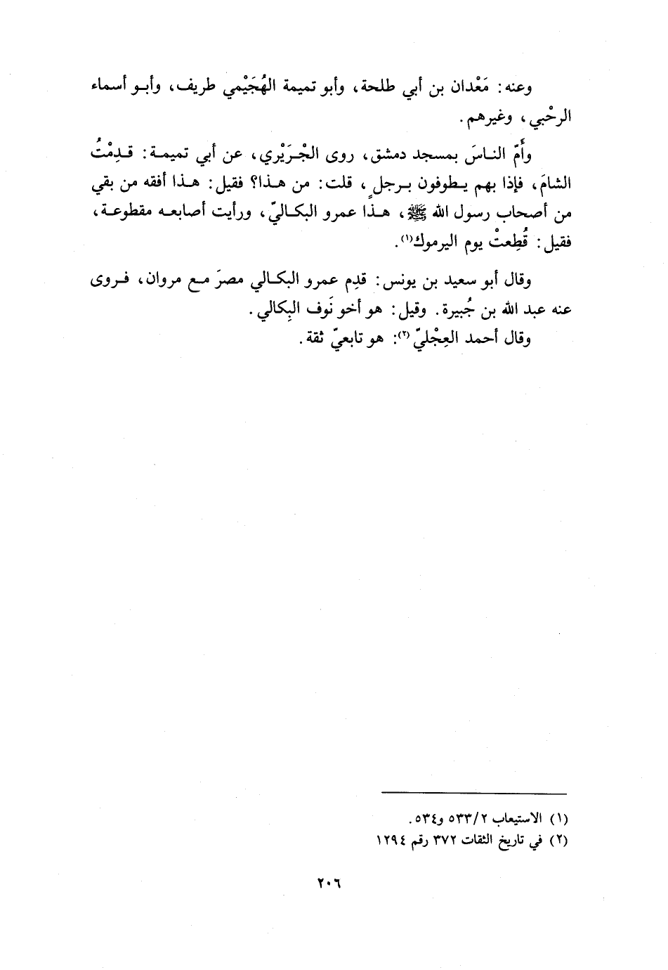 وَأَمَّ النَّاسَ بِمَسْجِدِ دِمَشْقَ، رَوَى الْجُرَيْرِيُّ، عَنْ أَبِي تَمِيمَةَ: قَدِمْتُ الشَّامَ، فَإِذَا بِهِمْ يَطُوفُونَ بِرَجُلٍ، قُلْتُ: مَنْ هَذَا؟ فَقِيلَ: هَذَا أَفْقَهُ مَنْ بَقِيَ مِنْ أَصْحَابِ رَسُولِ اللَّهِ صَلَّى اللَّهُ عَلَيْهِ وَسَلَّمَ، هَذَا عَمْرُو الْبِكَالِيُّ، وَرَأَيْتُ أَصَابِعَهُ مَقْطُوعَةً، فَقِيلَ: قُطِعَتْ يَوْمَ الْيَرْمُوكِ [1] .