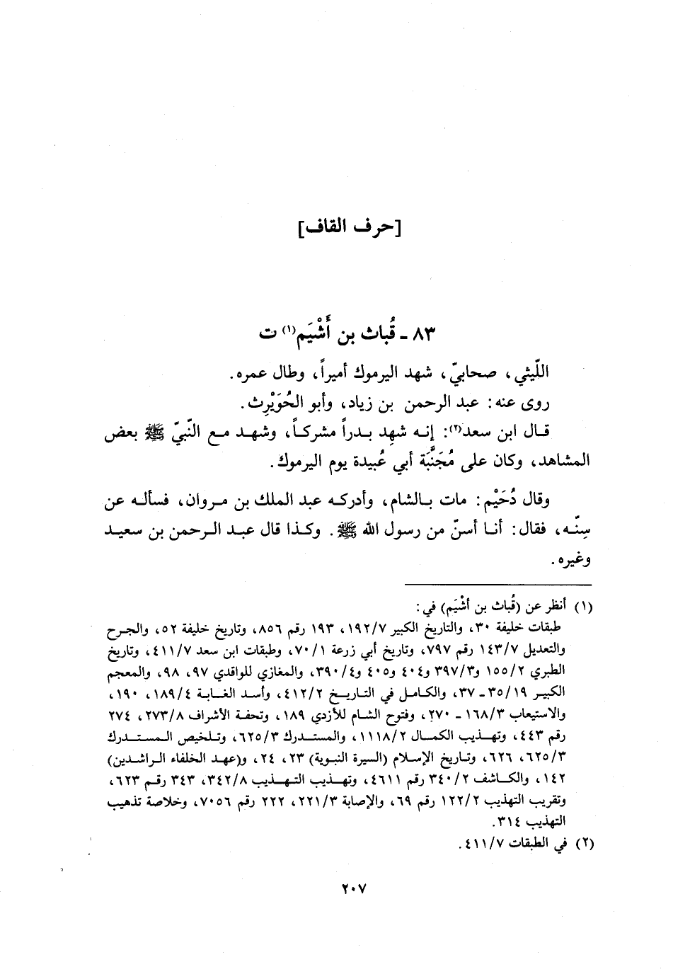 83- قباث بن أشيم [1] ت اللّيثي، صَحَابِيٌّ، شَهِدَ الْيَرْمُوكَ أَمِيرًا، وَطَالَ عُمْرُهُ.