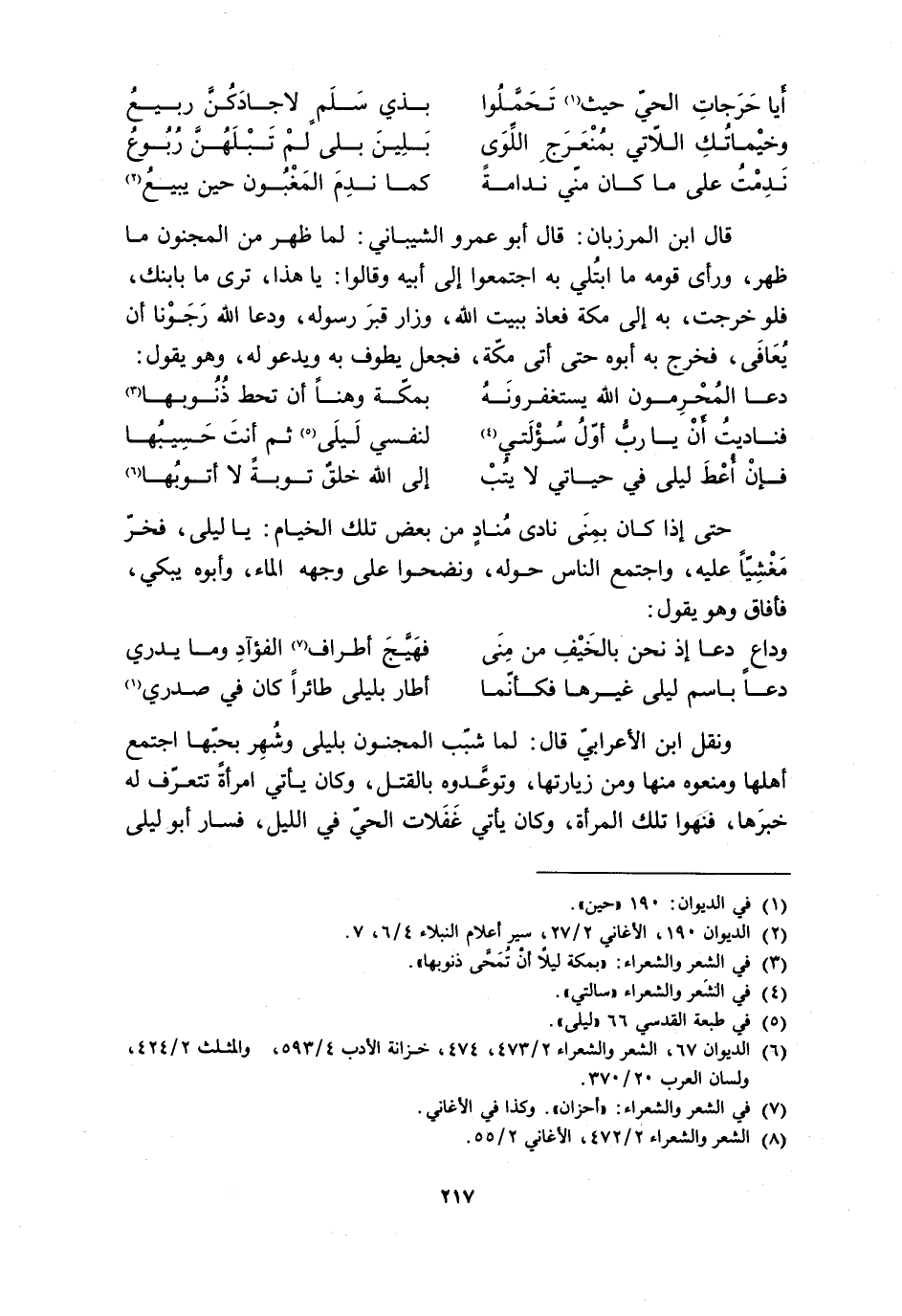 حَتَّى إِذَا كَانَ بِمِنًى نَادَى مُنَادٍ مِنْ بَعْضِ تِلْكَ الْخِيَامِ: يَا لَيْلَى، فَخَرَّ مَغْشِيًّا عَلَيْهِ، وَاجْتَمَعَ النَّاسُ حَوْلَهُ، وَنَضَحُوا عَلَى وَجْهِهِ الْمَاءَ، وَأَبُوهُ يَبْكِي، فَأَفَاقَ وَهُوَ يَقُولُ:
