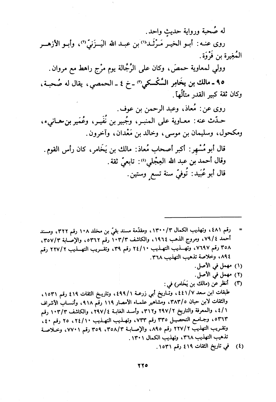 95- مالك بن يخامر السّكسكي [3]- خ 4- الحمصي، يُقَالُ لَهُ صُحْبَةٌ، وَكَانَ ثِقَةً كَبِيرَ الْقَدْرِ مُتَأَلِّهًا.