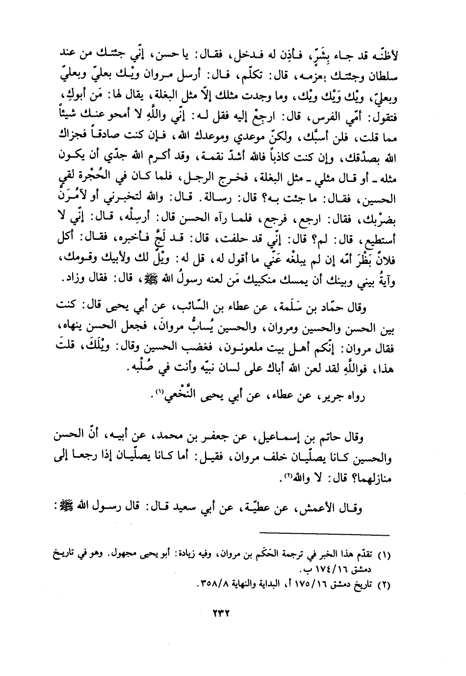 لأَظُّنُهُ قَدْ جَاءَ بِشَرٍّ، فَأَذِنَ لَهُ فَدَخَلَ، فَقَالَ: يَا حَسَنُ، إِنِّي جِئْتُكَ مِنْ عِنْدِ سُلْطَانٍ وَجِئْتُكَ بِعَزْمِهِ، قَالَ: تَكَلَّمْ، قَالَ: أَرْسَلَ مَرْوَانُ وَيْكَ بِعَلِيٍّ وَبِعَلِيٍّ وَبِعَلِيٍّ، وَيْكَ وَيْكَ وَيْكَ، وَمَا وَجَدْتُ مِثْلَكَ إِلا مِثْلَ الْبَغْلَةِ، يُقَالُ لَهَا: مَنْ أَبُوكِ، فتَقُولُ: أُمِّي الْفَرَسُ، قَالَ: ارْجِعْ إِلَيْهِ فَقُلْ لَهُ: إِنِّي وَاللَّهِ لا أَمْحُو عَنْكَ شَيْئًا مِمَّا قلت، فَلَنْ أَسُبَّكَ، وَلَكِنَّ مَوْعِدِي وَمَوْعِدُكَ اللَّهَ، فَإِنْ كُنْتَ صَادِقًا فَجَزَاكَ اللَّهُ بِصِدْقِكَ، وَإِنْ كُنْتَ كَاذِبًا فاللَّه أَشَدُّ نَقْمَةً، وَقَدْ أَكْرَمَ اللَّهُ جَدِّي أَنْ يَكُونَ مِثْلَهُ- أَوْ قَالَ مِثْلِي- مِثْلُ الْبَغْلَةِ، فَخَرَجَ الرَّجُلُ، فَلَمَّا كَانَ فِي الْحُجْرَةِ لقي الحسين، فَقَالَ: مَا جِئْتَ بِهِ؟ قَالَ: رِسَالَةٌ. قَالَ: وَاللَّهِ لَتُخْبِرُنِي أَوْ لَآمُرَنَّ بِضَرْبِكَ، فَقَالَ: ارْجِعْ، فَرَجَعَ، فَلَمَّا رَآهُ الْحَسَنُ قَالَ: أَرْسِلْهُ، قَالَ: إِنِّي لا أَسْتَطِيعُ، قَالَ: لِمَ؟ قَالَ: إِنِّي قَدْ حَلَفْتُ، قَالَ: قَدْ لَجَّ فَأَخْبَرَهُ، فَقَالَ: أَكَلَ فُلانٌ بَظْرَ أُمِّهِ إِنْ لَمْ يَبْلُغْهُ عَنِّي مَا أَقُولُ لَهُ، قُلْ لَهُ: وَيْلٌ لَكَ وَلِأَبِيكَ وَقَوْمِكَ، وَآيَةٌ بَيْنِي وَبَيْنِكَ أَنْ يَمْسِكَ مَنْكِبَيْكَ مِنْ لَعْنَةِ رَسُولِ اللَّهِ صَلَّى اللَّهُ عَلَيْهِ وَسَلَّمَ، قَالَ: فَقَالَ وَزَادَ. وَقَالَ حَمَّادُ بْنُ سَلَمَةَ، عَنْ عَطَاءِ بْنِ السَّائِبِ، عَنْ أَبِي يَحْيَى قَالَ: كُنْتُ بَيْنَ الْحَسْنِ وَالْحُسَيْنِ وَمَرْوَانَ، وَالْحُسَيْنُ يُسَابُّ مَرْوَانَ، فَجَعَلَ الْحَسْنُ يَنْهَاهُ، فَقَالَ مَرْوَانُ: إِنَّكُمْ أَهْلُ بَيْتٍ مَلْعُونُونَ، فغضب الحسين وقال: ويلك، قلت هذا، فو الله لقد لعن الله أباك على لسان نبيه وَأَنْتَ فِي صُلْبِهِ.