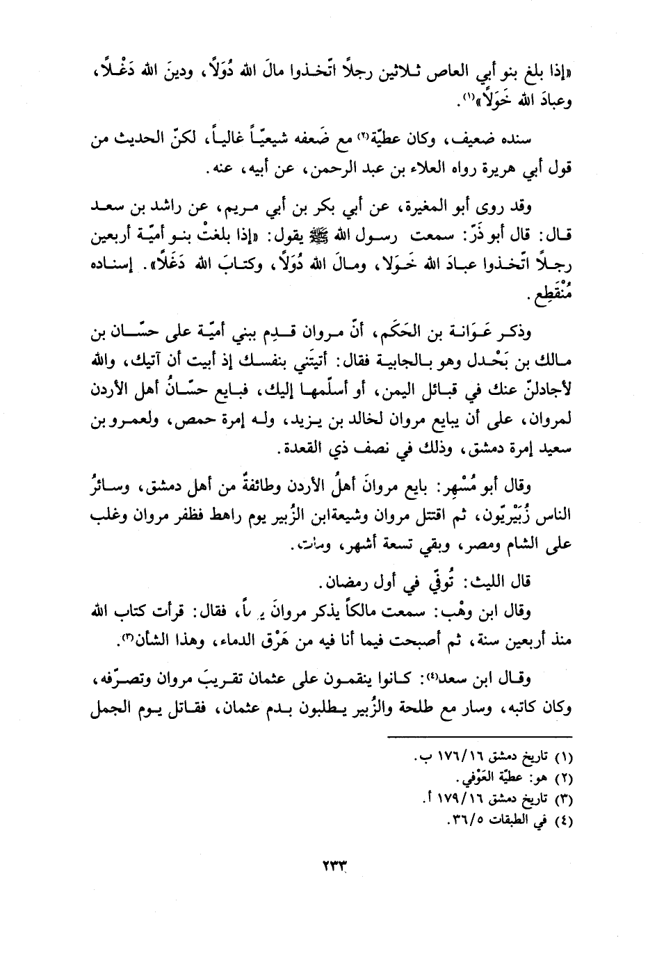 «إِذَا بَلَغَ بَنُو أَبِي الْعَاصِ ثَلاثِينَ رَجُلا اتَّخَذُوا مَالَ اللَّهِ دُوَلا، وَدِينَ اللَّهِ دَغَلا، وَعِبَادَ اللَّهِ خَوَلا» [1] . سَنَدُهُ ضَعِيفٌ، وَكَانَ عَطِيَّةُ [2] مَعَ ضَعْفِهِ شِيعِيًّا غَالِيًا، لَكِنَّ الْحَدِيثُ مِنْ قَوْلِ أَبِي هُرَيْرَةَ رَوَاهُ الْعَلاءُ بْنُ عَبْدِ الرَّحْمَنِ، عَنْ أَبِيهِ، عَنْهُ.