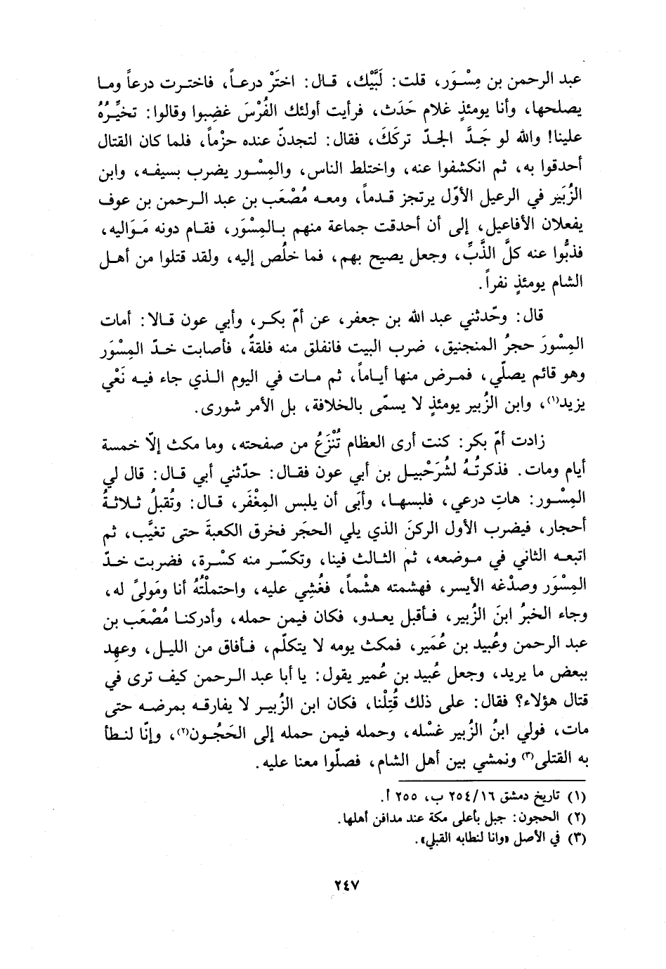 قَالَ: وَحَدَّثَنِي عبدَ اللَّهِ بْن جَعْفَر، عَنْ أمِّ بَكْرٍ، وَأَبِي عَوْنٍ قَالا: أَمَاتَ الْمِسْوَرَ حَجَرُ الْمَنْجِنيقِ، ضُرِبَ الْبَيْتُ فَانْفَلَقَ مِنْهُ فَلْقَةٌ، فَأَصَابَتْ خَدَّ الْمِسْوَرِ وَهُوَ قَائِمٌ يُصَلِّي، فَمَرِضَ مِنْهَا أَيَّامًا، ثُمَّ مَاتَ فِي الْيَوْمِ الَّذِي جَاءَ فِيهِ نَعْيُ يَزِيدَ [1] ، وَابْنُ الزُّبَيْرِ يَوْمَئِذٍ لا يُسَمَّى بِالْخِلافَةِ، بَلِ الأَمْرُ شُورَى.