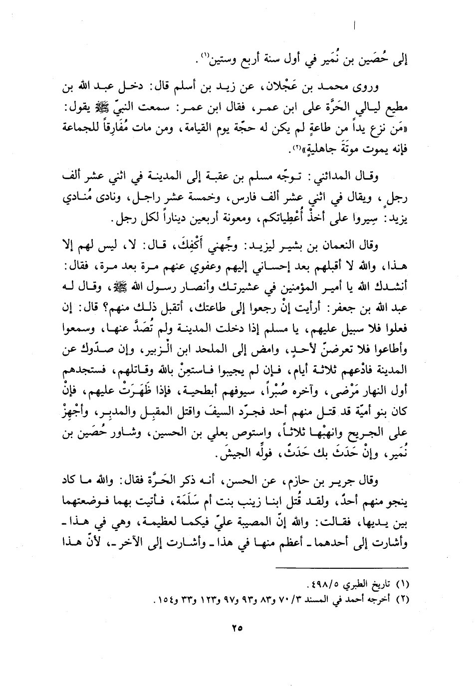 «مَنْ نَزَعَ يَدًا مِنْ طَاعَةٍ لَمْ يَكُنْ لَهُ حُجَّةٌ يَوْمَ الْقِيَامَةِ، وَمَنْ مَاتَ مُفَارِقًا لِلْجَمَاعَةِ فَإِنَّهُ يَمُوتُ مَوْتَةَ جَاهِلِيَّةٍ» [2] . وَقَالَ الْمَدَائِنِيُّ: تَوَجَّه مُسْلِمُ بْنُ عُقْبَةَ إِلَى الْمَدِينَةِ فِي اثْنَيْ عَشَرَ أَلْفَ رَجُلٍ، وَيُقَالُ فِي اثْنَيْ عَشَرَ أَلْفَ فَارِسٍ، وَخَمْسَةَ عَشَرَ رَاجِلٍ، وَنَادَى مُنَادِي يَزِيدَ: سِيرُوا عَلَى أَخْذِ أعطياتكم، وَمَعُونَةِ أَرْبَعِينَ دِينَارًا لِكُلِّ رَجُلٍ.