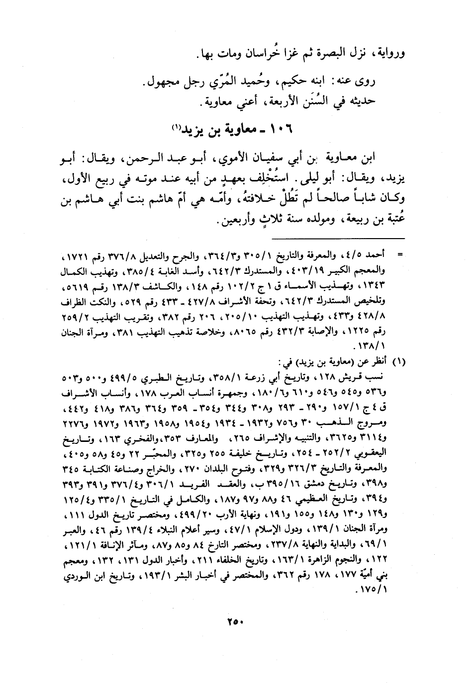 106- مُعَاوِيَةُ بْنُ يَزِيدَ [1] ابْنِ مُعَاوِيَةَ بْنِ أَبِي سُفْيَانَ الأُمَوِيُّ، أَبُو عَبْدِ الرَّحْمَنِ، وَيُقَالُ: أَبُو يَزِيدَ، وَيُقَالُ: أَبُو لَيْلَى. استُخْلِفَ بِعَهْدٍ مِنْ أَبِيهِ عِنْدَ مَوْتِهِ فِي رَبِيعِ الأَوَّلِ، وَكَانَ شَابًّا صَالِحًا لَمْ تَطُلْ خِلافَتُهُ، وَأُمُّهُ هِيَ أُمُّ هَاشِمٍ بِنْتُ أَبِي هَاشِمِ بْنِ عُتْبَةَ بْنِ رَبِيعَةَ، وَمَوْلِدُهُ سَنَةَ ثَلاثٍ وَأَرْبَعِينَ.