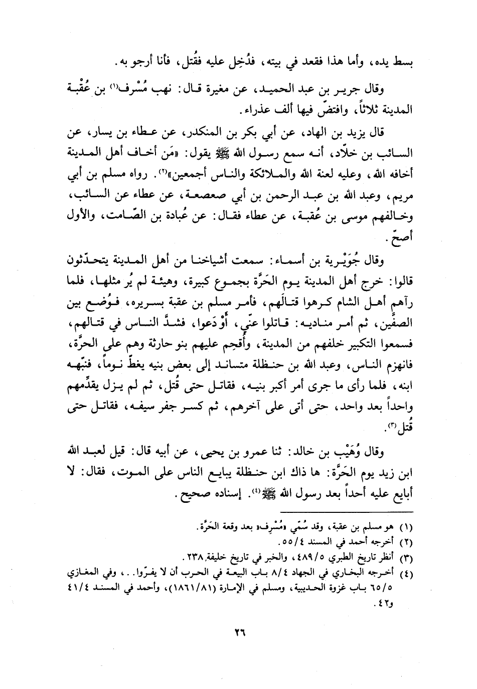 وَقَالَ وُهَيْبُ بْنُ خَالِدٍ: ثنا عَمْرُو بْنُ يَحْيَى، عَنْ أَبِيهِ قَالَ: قِيلَ لعبد الله ابن زَيْدٍ يَوْمَ الْحَرَّةِ: هَا ذَاكَ ابْنُ حَنْظَلَةَ يُبَايِعُ النَّاسَ عَلَى الْمَوْتِ، فَقَالَ: لَا أُبَايِعُ عَلَيْهِ أَحَدًا بَعْدَ رَسُولِ اللَّهِ صَلَّى اللَّهُ عَلَيْهِ وَسَلَّمَ [4] . إسناده صحيح.