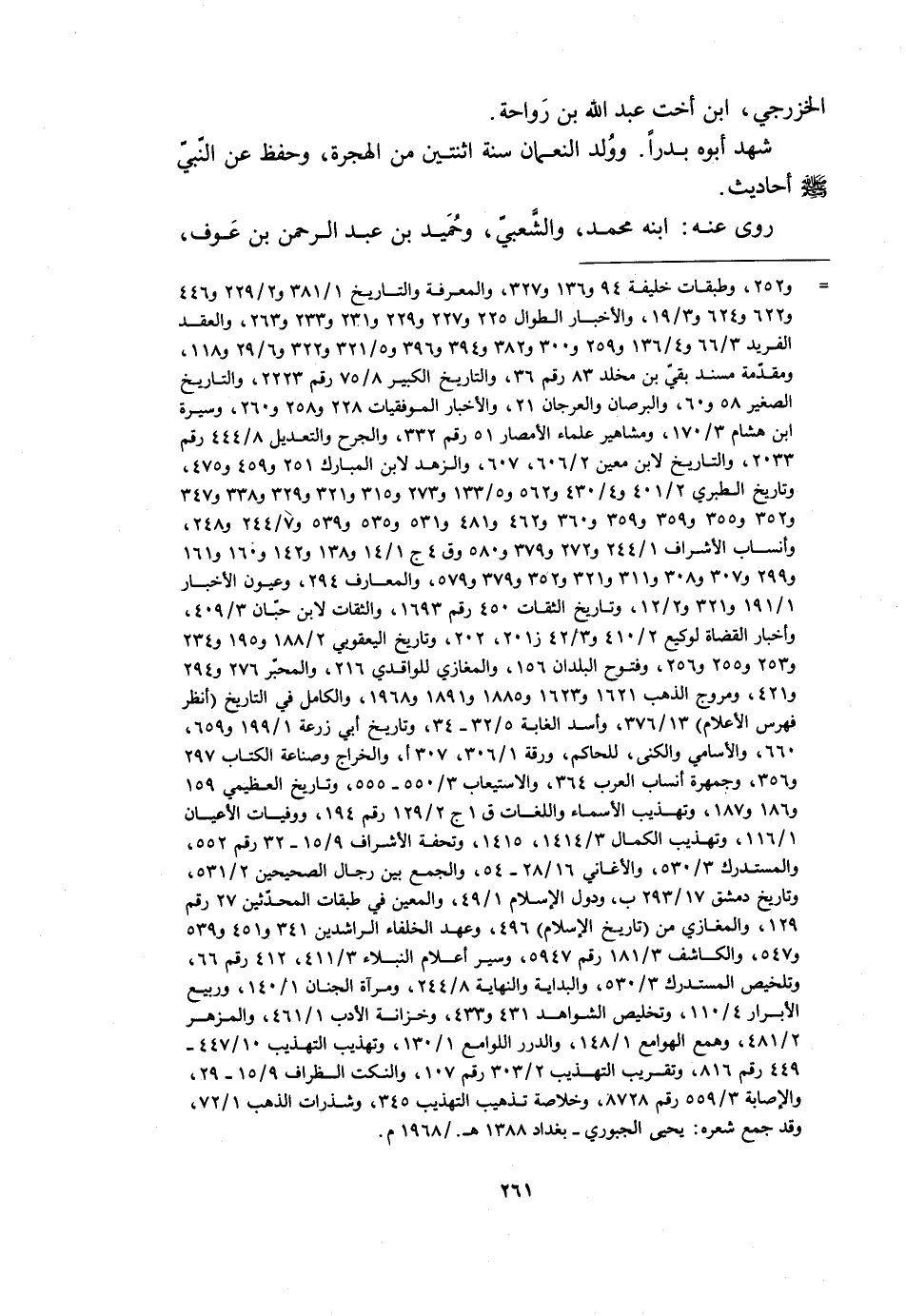 [ () ] و 252، وطبقات خليفة 94 و 136 و 327، والمعرفة والتاريخ 1/ 381 و 2/ 229 و 446 و 622 و 624 و 3/ 19، والأخبار الطوال 225 و 227 و 229 و 231 و 233 و 263، والعقد الفريد 3/ 66 و 4/ 136 و 259 و 300 و 382 و 394 و 396 و 5/ 321 و 322 و 6/ 29 و 118، ومقدّمة مسند بقيّ بن مخلد 83 رقم 36، والتاريخ الكبير 8/ 75 رقم 2223، والتاريخ الصغير 58 و 60، والبرصان والعرجان 21، والأخبار الموفقيات 228 و 258 و 260، وسيرة ابن هشام 3/ 170، ومشاهير علماء الأمصار 51 رقم 332، والجرح والتعديل 8/ 444 رقم 2033، والتاريخ لابن معين 2/ 606، 607، والزهد لابن المبارك 251 و 459 و 475، وتاريخ الطبري 2/ 401 و 4/ 430 و 562 و 5/ 133 و 273 و 315 و 321 و 329 و 338 و 347 و 352 و 355 و 359 و 360 و 462 و 481 و 531 و 535 و 539 و 7/ 244 و 248، وأنساب الأشراف 1/ 244 و 272 و 379 و 580 وق 4 ج 1/ 14، و 138 و 142 و 160 و 161 و 299 و 307 و 308 و 311 و 321 و 352 و 379 و 579، والمعارف 294، وعيون الأخبار 1/ 191 و 321 و 2/ 12، وتاريخ الثقات 450 رقم 1693، والثقات لابن حبّان 3/ 409، وأخبار القضاة لوكيع 2/ 410 و 3/ 42 ز 201، 202، وتاريخ اليعقوبي 2/ 188 و 195 و 234 و 253 و 255 و 256، وفتوح البلدان 156، والمغازي للواقدي 216، والمحبّر 276 و 294 و 421، ومروج الذهب 1621 و 1623 و 1885 و 1891 و 1968، والكامل في التاريخ (انظر فهرس الأعلام) 13/ 376، وأسد الغابة 5/ 32- 34، وتاريخ أبي زرعة 1/ 199 و 659، 660، والأسامي والكنى، للحاكم، ورقة 1/ 306، 307 أ، والخراج وصناعة الكتاب 297 و 356، وجمهرة أنساب العرب 364، والاستيعاب 3/ 550- 555، وتاريخ العظيمي 159 و 186 و 187، وتهذيب الأسماء واللغات ق 1 ج 2/ 129 رقم 194، ووفيات الأعيان 1/ 116، وتهذيب الكمال 3/ 1414، 1415، وتحفة الأشراف 9/ 15- 32 رقم 552، والمستدرك 3/ 530، والأغاني 16/ 28- 54، والجمع بين رجال الصحيحين 2/ 531، وتاريخ دمشق 17/ 293 ب، ودول الإسلام 1/ 49، والمعين في طبقات المحدّثين 27 رقم 129، والمغازي من (تاريخ الإسلام) 496، وعهد الخلفاء الراشدين 341 و 451 و 539 و 547، والكاشف 3/ 181 رقم 5947، وسير أعلام النبلاء 3/ 411، 412 رقم 66، وتلخيص المستدرك 3/ 530، والبداية والنهاية 8/ 244، ومرآة الجنان 1/ 140، وربيع الأبرار 4/ 110، وتخليص الشواهد 431 و 433، وخزانة الأدب 1/ 461، والمزهر 2/ 481، وهمع الهوامع 1/ 148، والدرر اللوامع 1/ 130، وتهذيب التهذيب 10/ 447- 449 رقم 816، وتقريب التهذيب 2/ 303 رقم 107، والنكت الظراف 9/ 15- 29، والإصابة 3/ 559 رقم 8728، وخلاصة تذهيب التهذيب 345، وشذرات الذهب 1/ 72، وقد جمع شعره: يحيى الجبوري- بغداد 1388 هـ. / 1968 م.