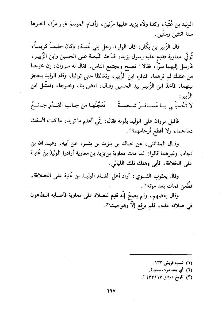 قَالَ الزُّبَيْرُ بْنُ بَكَّارٍ: كَانَ الْوَلِيدُ رَجُلَ بَنِي عُتْبَةَ، وَكَانَ حَلِيمًا كَرِيمًا، تُوُفِّيَ مُعَاوِيَةُ فَقَدِمَ عَلَيْهِ رَسُولُ يَزِيدَ، فَأَخَذَ الْبَيْعَةَ عَلَى الْحُسَيْنِ وَابْنِ الزُّبَيْرِ، فَأَرْسَلَ إِلَيْهِمَا سِرًّا، فَقَالا: نُصْبِحُ وَيَجْتَمِعُ النَّاسُ، فَقَالَ لَهُ مَرْوَانُ: إِنْ خَرَجَا مِنْ عِنْدَكَ لَمْ نَرَهُمَا، فَنَافَرَهُ ابْنُ الزُّبَيْرِ، وَتَغَالَظَا حَتَّى تَوَاثَبَا، وَقَامَ الْوَلِيدُ يُحَجِّزُ بَيْنَهُمَا، فَأَخَذَ ابْنُ الزُّبَيْرِ بِيَدِ الْحُسَيْنِ وَقَالَ: امْضِ بِنَا، وَخَرَجَا، وَتَمَثَّلَ ابْنُ الزُّبَيْرِ: