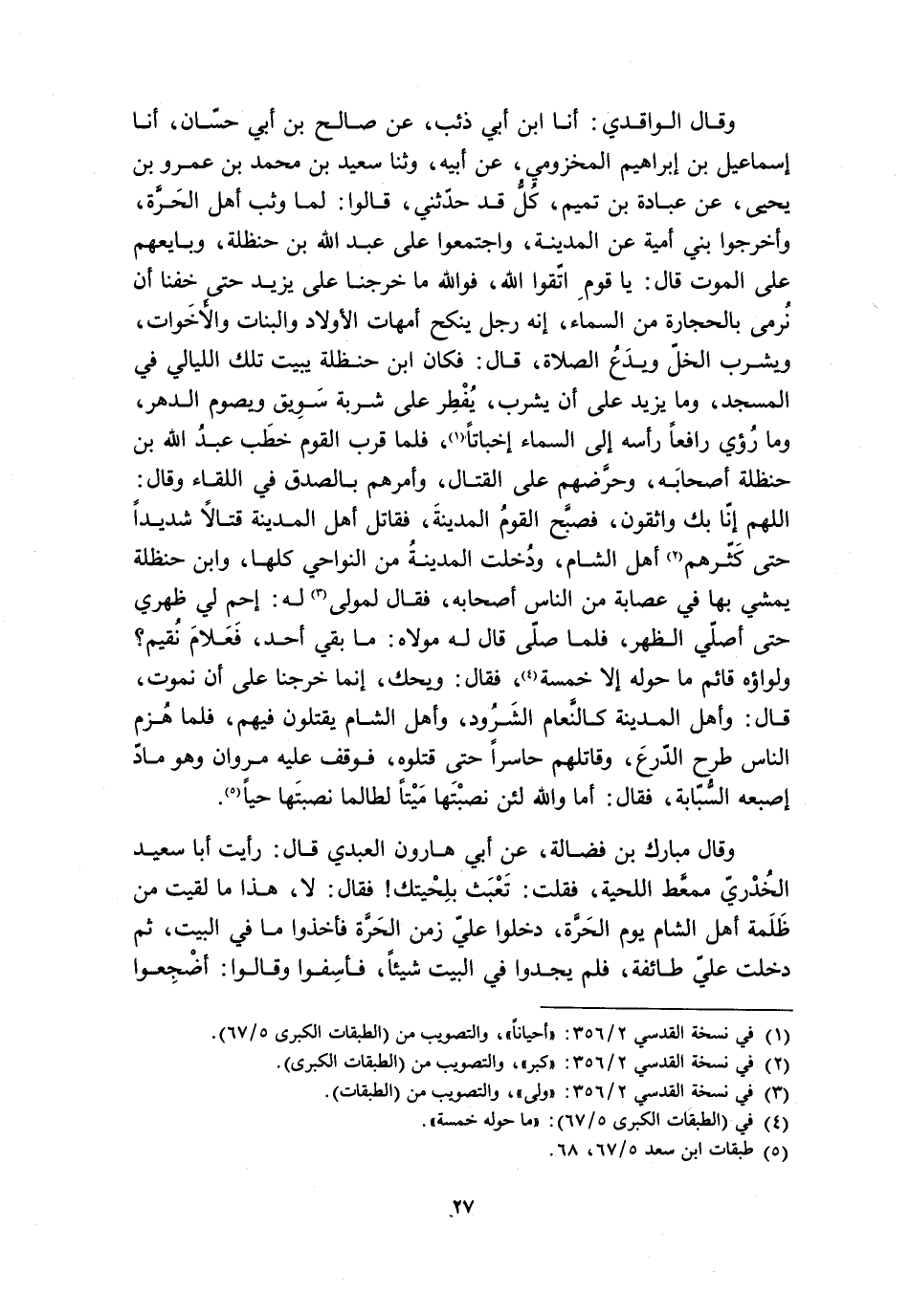 وَقَالَ الْوَاقِدِيُّ: أَنَا ابْنُ أَبِي ذِئْبٍ، عَنْ صَالِحِ بْنِ أَبِي حَسَّانٍ، أنا إِسْمَاعِيلُ بْنُ إِبْرَاهِيمَ الْمَخْزُومِيُّ، عَنْ أَبِيهِ، وَثنا سَعِيدُ بْنُ مُحَمَّدِ بْنِ عَمْرِو بْنِ يَحْيَى، عَنْ عُبَادَةَ بْنِ تَمِيمٍ، كُلُّ قَدْ حَدَّثَنِي، قَالُوا: لَمَّا وَثَبَ أَهْلُ الْحَرَّةِ، وَأَخْرَجُوا بَنِي أُمَيَّةَ عَنِ الْمَدِينَةِ، وَاجْتَمَعُوا عَلَى عَبْدِ اللَّهِ بْنِ حَنْظَلَةَ، وَبَايَعَهُمْ عَلَى الْمَوْتِ قَالَ: يَا قَوْمُ اتَّقُوا الله، فو الله مَا خَرَجْنَا عَلَى يَزِيدَ حَتَّى خِفْنَا أَنْ نُرْمَى بِالْحِجَارَةِ مِنَ السَّمَاءِ، إِنَّهُ رَجُلٌ يَنْكِحُ أُمَّهَاتِ الْأَوْلَادِ وَالْبَنَاتِ وَالْأَخَوَاتِ، وَيَشْرَبُ الْخَلَّ وَيَدَعُ الصَّلَاةَ، قَالَ: فَكَانَ ابْنُ حَنْظَلَةَ يَبِيتُ تِلْكَ اللَّيَالِي فِي الْمَسْجِدِ، وَمَا يَزِيدُ عَلَى أَنْ يَشْرَبَ، يُفْطِرُ عَلَى شَرْبَةِ سَوِيقٍ وَيَصُومُ الدَّهْرَ، وما رئي رَافِعًا رَأْسَهُ إِلَى السَّمَاءِ إِخْبَاتًا [1] ، فَلَمَّا قَرُبَ الْقَوْمُ خَطَبَ عَبْدُ اللَّهِ بْنُ حَنْظَلَةَ أَصْحَابَهُ، وَحَرَّضَهُمْ عَلَى الْقِتَالِ، وَأَمَرَهُمْ بِالصِّدْقِ فِي اللِّقَاءِ وَقَالَ: