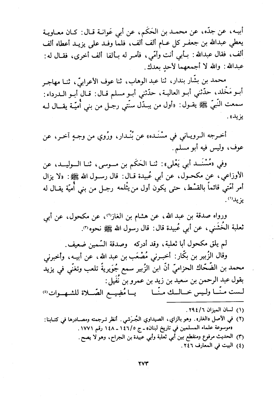 أَخْرَجَهُ الرُّويَانِيُّ فِي مُسْنَدِه» عَنْ بُنْدَارٍ، وَرُوِيَ مِنْ وَجْهٍ آخَرَ، عَنْ عَوْفٍ، وَلَيْسَ فِيهِ أَبُو مُسْلِمٍ. وَفِي «مُسْنَدِ أَبِي يَعْلَى» : ثنا الْحَكَمُ بْنُ مُوسَى، ثنا الْوَلِيدُ، عَنِ الأَوْزَاعِيِّ، عَنْ مَكْحُولٍ، عَنْ أَبِي عُبَيْدَةَ قَالَ: قَالَ رَسُولُ اللَّهِ صَلَّى اللَّهُ عَلَيْهِ وَسَلَّمَ: «لا يَزَالُ أَمْرُ أُمَّتِي قَائِمًا بِالْقِسْطِ، حَتَّى يَكُونَ أَوَّلُ مَنْ يَثْلَمُهُ رَجُلٌ مِنْ بَنِي أُمَيَّةَ يُقَالَ لَهُ يَزِيدُ [1] . وَرَوَاهُ صَدَقَةُ بْنُ عَبْدِ اللَّهِ، عَنْ هِشَامِ بْنِ الْغَازِ [2] ، عَنْ مَكْحُولٍ، عَنْ أَبِي ثَعْلَبَةَ الْخَشْنِيِّ، عَنْ أَبِي عُبَيْدَةَ قَالَ: قَالَ رَسُولُ اللَّهِ صَلَّى اللَّهُ عَلَيْهِ وَسَلَّمَ نَحْوَهُ [3] .