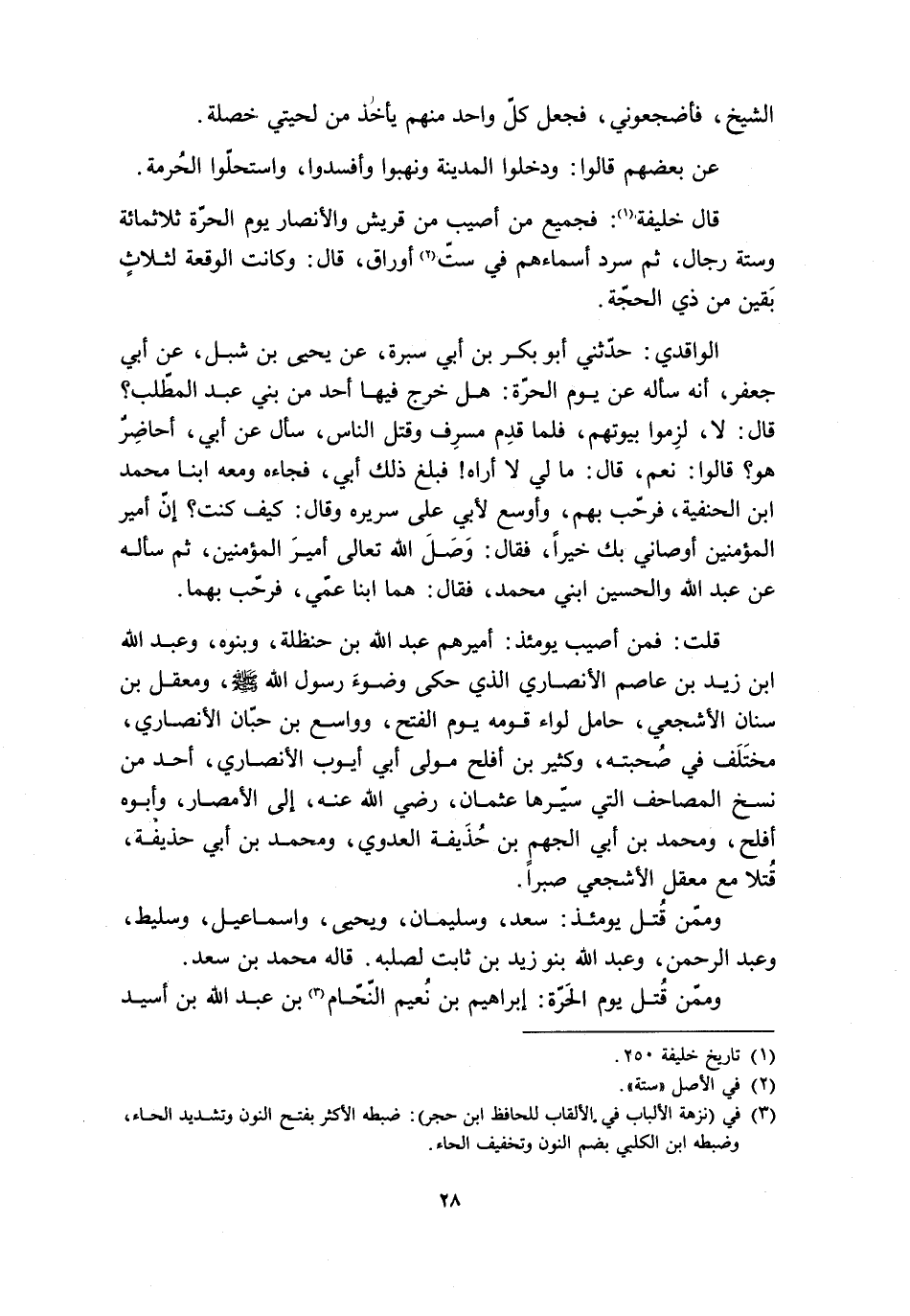 قَالَ خَلِيفَةُ [1] : فَجَمِيعُ مَنْ أُصِيبَ مِنْ قُرَيْشٍ وَالْأَنْصَارِ يَوْمَ الْحُرَّةِ ثَلَاثُمِائَةٍ وَسِتَّةُ رِجَالٍ، ثُمَّ سَرَدَ أَسْمَاءَهُمْ فِي سِتِّ [2] أَوْرَاقٍ، قَالَ: وَكَانَتِ الوقعة لِثَلَاثٍ بَقِينَ مِنْ ذِي الْحِجَّةِ.