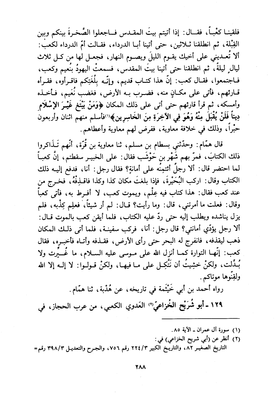 أَلا تُعْدِينِي عَلَى أَخِيكَ يَقُومُ اللَّيْلَ وَيَصُومُ النَّهَارَ، فَجَعَلَ لَهَا مِنْ كُلِّ ثَلاثِ لَيَالٍ لَيْلَةً، ثُمَّ انْطَلَقْنَا حَتَّى أَتَيْنَا بَيْتَ الْمَقْدِسِ، فَسَمِعَتِ الْيَهُودُ بِنُعَيْمٍ وَكَعْبٍ، فَاجْتَمَعُوا، فَقَالَ كَعْبٌ: إِنَّ هَذَا كِتَابٌ قَدِيمٌ، وَإِنَّهُ بلغتكم فاقرءوه، فَقَرَأَهُ قَارِئُهُمْ، فَأَتَى عَلَى مَكَانٍ مِنْهُ، فَضَرَبَ بِهِ الأَرْضَ، فَغَضِبَ نُعَيْمٌ، فَأَخَذَهُ وَأَمْسَكَهُ، ثم قَرَأَ قَارِئُهُمْ حَتَّى أَتَى عَلَى ذَلِكَ الْمَكَانَ وَمن يَبْتَغِ غَيْرَ الْإِسْلامِ دِيناً فَلَنْ يُقْبَلَ مِنْهُ وَهُوَ في الْآخِرَةِ من الْخاسِرِينَ 3: 85 [1] فَأَسْلَمَ مِنْهُمُ اثْنَانِ وَأَرْبَعُونَ حَبْرًا، وَذَلِكَ فِي خِلافَةِ مُعَاوِيَةَ، فَفَرَضَ لَهُمْ مُعَاوِيَةُ وَأَعْطَاهُمْ.