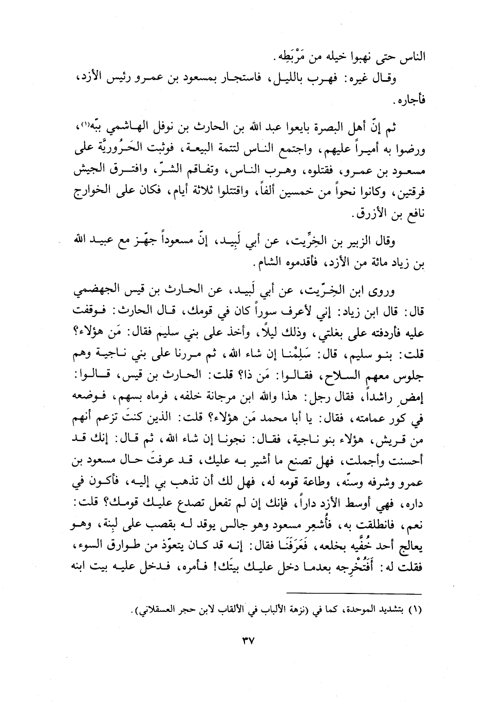 ثُمَّ إِنَّ أَهْلَ الْبَصْرَةِ بَايَعُوا عَبْدَ اللَّهِ بْنَ الْحَارِثِ بْنِ نَوْفَلٍ الْهَاشِمِيَّ بَبَّةَ [1] ، وَرَضُوا بِهِ أَمِيرًا عَلَيْهِمْ، وَاجْتَمَعَ الناس لتتمة الْبَيْعَةِ، فَوَثَبَتِ الْحَرُوريَّةُ عَلَى مَسْعُودِ بْنِ عَمْرٍو، فَقَتَلُوهُ، وَهَرَبَ النَّاسُ، وَتَفَاقَمَ الشَّرُّ، وَافْتَرَقَ الْجَيْشُ فرقتين، وكانوا نحوا من خَمْسِينَ أَلْفًا، وَاقْتَتَلُوا ثَلَاثَةَ أَيَّامٍ، فَكَانَ عَلَى الْخَوَارِجِ نَافِعُ بْنُ الْأَزْرَقِ.