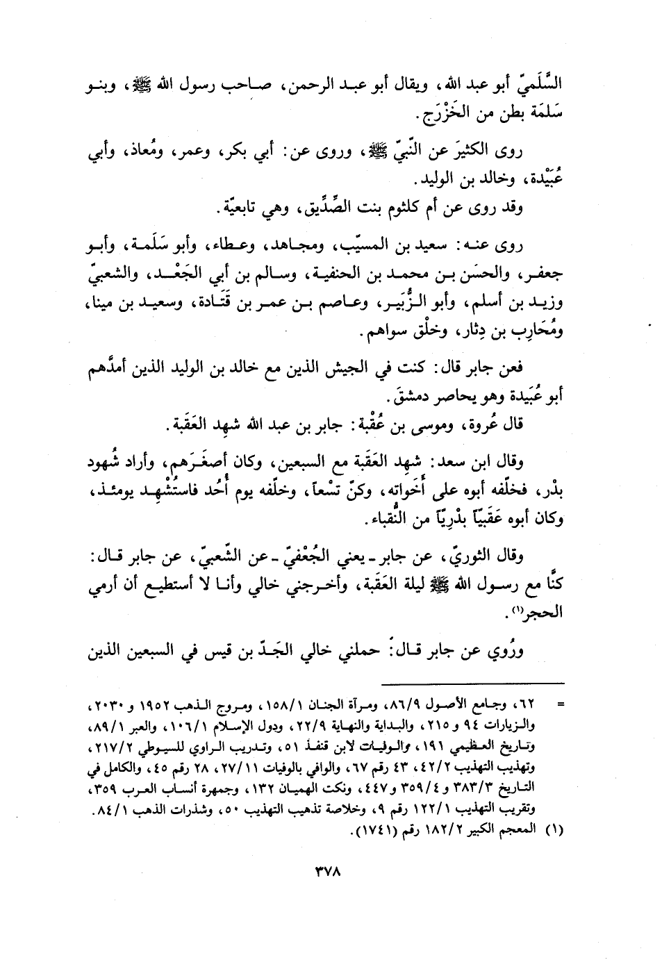 [ () ] 62، وجامع الأصول 9/ 86، ومرآة الجنان 1/ 158، ومروج الذهب 1952 و 2030، والزيارات 94 و 215، والبداية والنهاية 9/ 22، ودول الإسلام 1/ 106، والعبر 1/ 89، وتاريخ العظيمي 191، والوفيات لابن قنفذ 51، وتدريب الراويّ للسيوطي 2/ 217، وتهذيب التهذيب 2/ 42، 43 رقم 67، والوافي بالوفيات 11/ 27، 28 رقم 45، والكامل في التاريخ 3/ 383 و 4/ 359 و 447، ونكت الهميان 132، وجمهرة أنساب العرب 359، وتقريب التهذيب 1/ 122 رقم 9، وخلاصة تذهيب التهذيب 50، وشذرات الذهب 1/ 84.