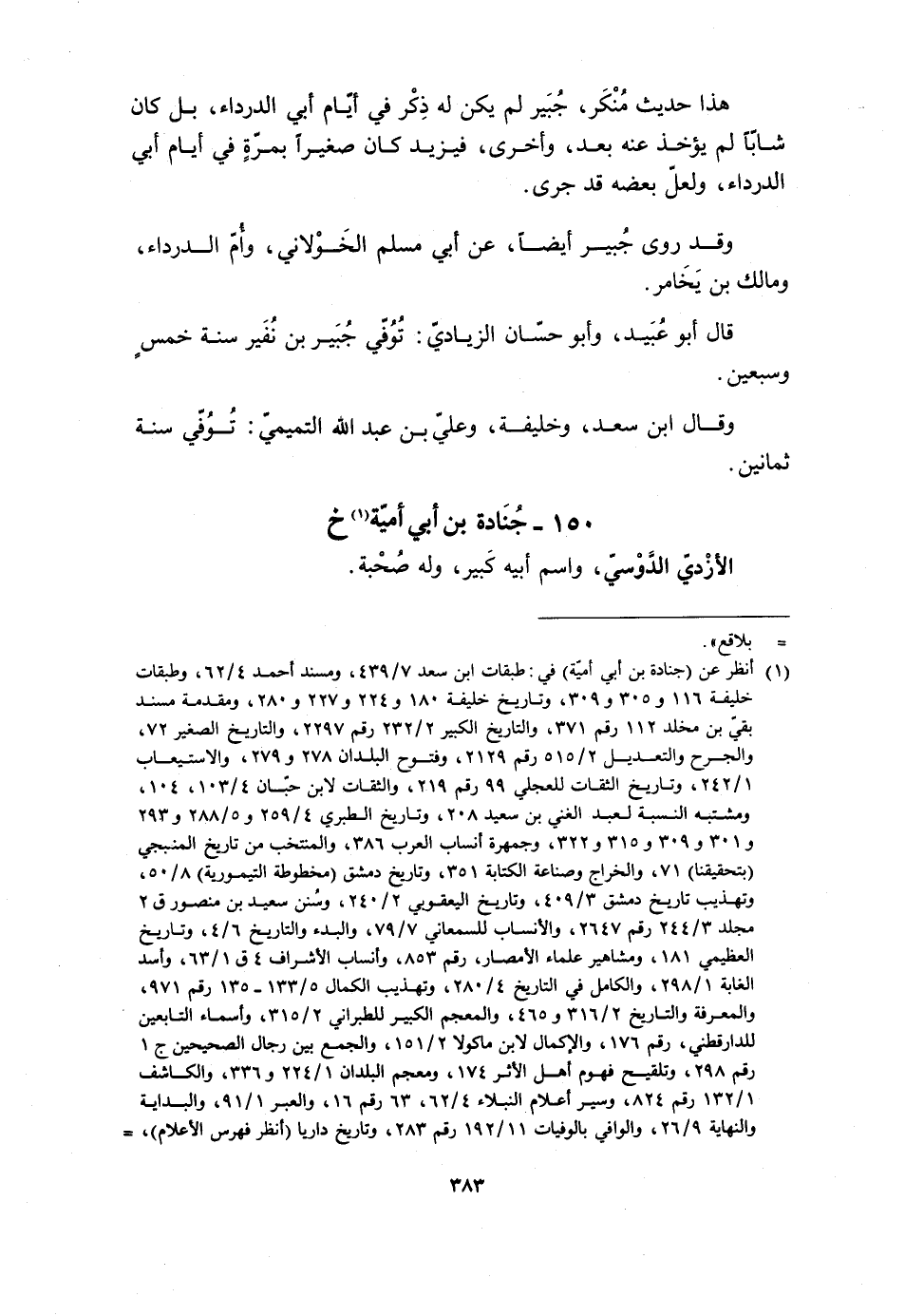 [1] انظر عن (جنادة بن أبي أميّة) في: طبقات ابن سعد 7/ 439، ومسند أحمد 4/ 62، وطبقات خليفة 116 و 305 و 309، وتاريخ خليفة 180 و 224 و 227 و 280، ومقدمة مسند بقيّ بن مخلد 112 رقم 371، والتاريخ الكبير 2/ 232 رقم 2297، والتاريخ الصغير 72، والجرح والتعديل 2/ 515 رقم 2129، وفتوح البلدان 278 و 279، والاستيعاب 1/ 242، وتاريخ الثقات للعجلي 99 رقم 219، والثقات لابن حبّان 4/ 103، 104، ومشتبه النسبة لعبد الغني بن سعيد 208، وتاريخ الطبري 4/ 259 و 5/ 288 و 293 و 301 و 309 و 315 و 322، وجمهرة أنساب العرب 386، والمنتخب من تاريخ المنبجي (بتحقيقنا) 71، والخراج وصناعة الكتابة 351، وتاريخ دمشق (مخطوطة التيمورية) 8/ 50، وتهذيب تاريخ دمشق 3/ 409، وتاريخ اليعقوبي 2/ 240، وسنن سعيد بن منصور ق 2 مجلد 3/ 244 رقم 2647، والأنساب للسمعاني 7/ 79، والبدء والتاريخ 6/ 4، وتاريخ العظيمي 181، ومشاهير علماء الأمصار، رقم 853، وأنساب الأشراف 4 ق 1/ 63، وأسد الغابة 1/ 298، والكامل في التاريخ 4/ 280، وتهذيب الكمال 5/ 133- 135 رقم 971، والمعرفة والتاريخ 2/ 316 و 465، والمعجم الكبير للطبراني 2/ 315، وأسماء التابعين للدارقطنيّ، رقم 176، والإكمال لابن ماكولا 2/ 151، والجمع بين رجال الصحيحين ج 1 رقم 298، وتلقيح فهوم أهل الأثر 174، ومعجم البلدان 1/ 224 و 336، والكاشف 1/ 132 رقم 824، وسير أعلام النبلاء 4/ 62، 63 رقم 16، والعبر 1/ 91، والبداية والنهاية 9/ 26، والوافي بالوفيات 11/ 192 رقم 283، وتاريخ داريا (انظر فهرس الأعلام) ،