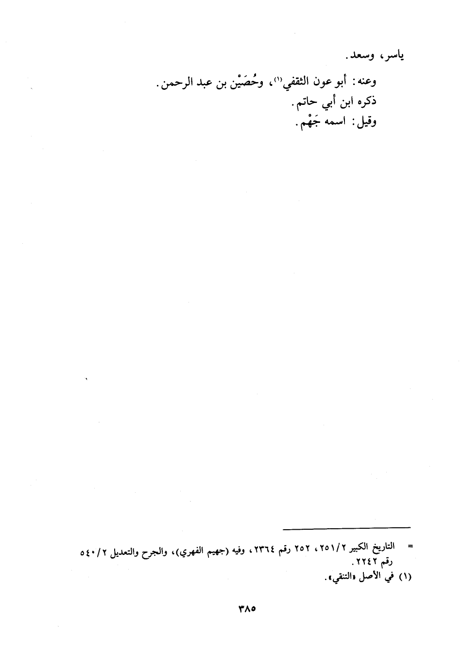 [ () ] التاريخ الكبير 2/ 251، 252 رقم 2364، وفيه (جهيم الفهري) ، والجرح والتعديل 2/ 540 رقم 2242.
