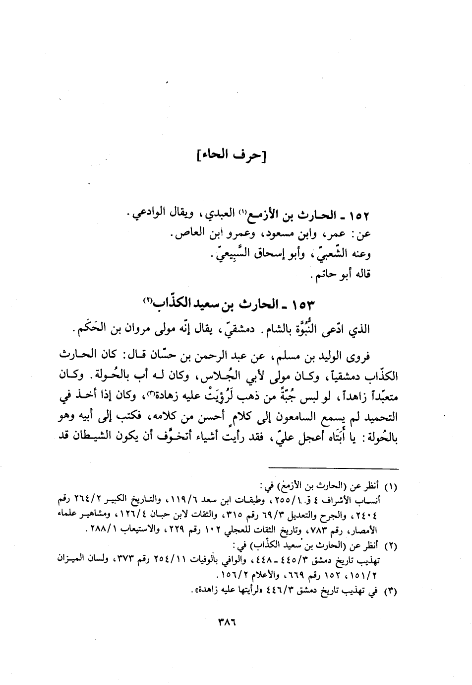 فَرَوَى الْوَلِيدُ بْنُ مُسْلِمٍ، عَنْ عَبْدِ الرَّحْمَنِ بْنِ حَسَّانٍ قَالَ: كَانَ الْحَارِثُ الْكَذَّابُ دِمَشْقِيًّا، وَكَانَ مَوْلَى لِأَبِي الْجُلاسِ، وَكَانَ لَهُ أَبٌ بِالْحُولَةِ. وَكَانَ مُتَعَبِّدًا زَاهِدًا، لَوْ لَبِسَ جُبَّةً مِنْ ذَهَبٍ لَرُؤيَتْ عَلَيْهِ زُهَادَةٌ [3] ، وَكَانَ إِذَا أَخَذَ فِي التَّحْمِيدِ لَمْ يَسْمَعِ السَّامِعُونَ إِلَى كَلامِ أَحْسَنَ مِنْ كَلامِهِ، فَكَتَبَ إِلَى أَبِيهِ وَهُوَ بِالْحُولَةِ: يَا أَبَتَاهُ أَعْجِلْ عَلَيَّ، فَقَدْ رَأَيْتَ أَشْيَاءَ أَتَخَوَّفُ أَنْ يكون الشيطان قد