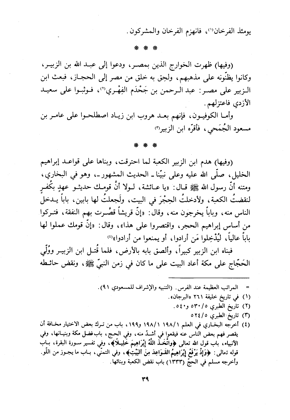 وَأَمَّا الْكُوفِيُّونَ، فَإِنَّهُمْ بَعْدَ هُرُوبِ ابْنِ زِيَادٍ اصْطَلَحُوا عَلَى عَامِرِ بْنِ مَسْعُودٍ الْجُمَحِيِّ، فَأَقَرَّهُ ابْنُ الزُّبَيْرِ [3] (وَفِيهَا) هَدَمَ ابْنُ الزُّبَيْرِ الْكَعْبَةَ لَمَّا احْتَرَقَتْ، وَبَنَاهَا عَلَى قَوَاعِدِ إِبْرَاهِيمَ الْخَلِيلِ، صَلَّى اللَّهُ عَلَيْهِ وَعَلَى نَبِيِّنَا- الْحَدِيثَ الْمَشْهُورَ-، وَهُوَ فِي الْبُخَارِيِّ، وَمَتْنُهُ أَنَّ رَسُولَ اللَّهِ صَلَّى اللَّهُ عَلَيْهِ وَسَلَّمَ قَالَ: «يَا عَائِشَةُ، لَوْلَا أَنَّ قَوْمَكِ حَدِيثُو عَهْدٍ بِكُفْرٍ لَنَقَضْتُ الْكَعْبَةَ، وَلَأَدْخَلْتُ الْحِجْرَ فِي الْبَيْتِ، وَلَجَعَلْتُ لَهَا بَابَيْنِ، بَابًا يَدْخُلُ النَّاسُ مِنْهُ، وَبَابًا يَخْرُجُونَ مِنْهُ، وَقَالَ: «إِنَّ قُرَيْشًا قَصَّرَتْ بِهِمُ النَّفَقَةُ، فَتَرَكُوا مِنْ أَسَاسِ إِبْرَاهِيمَ الْحِجْرَ، وَاقْتَصَرُوا عَلَى هَذَا» ، وَقَالَ: «إِنَّ قَوْمَكِ عَمِلُوا لَهَا بَابًا عَالِيًا، لِيُدْخِلُوا مَنْ أَرَادُوا، أَوْ يَمْنَعُوا مَنْ أَرَادُوا» [4] فَبَنَاهُ ابْنُ الزُّبَيْرِ كَبِيرًا، وَأَلْصَقَ بَابَهُ بِالْأَرْضِ، فَلَمَّا قُتِلَ ابْنُ الزُّبَيْرِ وَوُلِّيَ الْحَجَّاجُ عَلَى مَكَّةَ أَعَادَ الْبَيْتَ عَلَى مَا كَانَ فِي زَمَنِ النَّبِيِّ صَلَّى اللَّهُ عَلَيْهِ وسلّم، ونقض حائطه