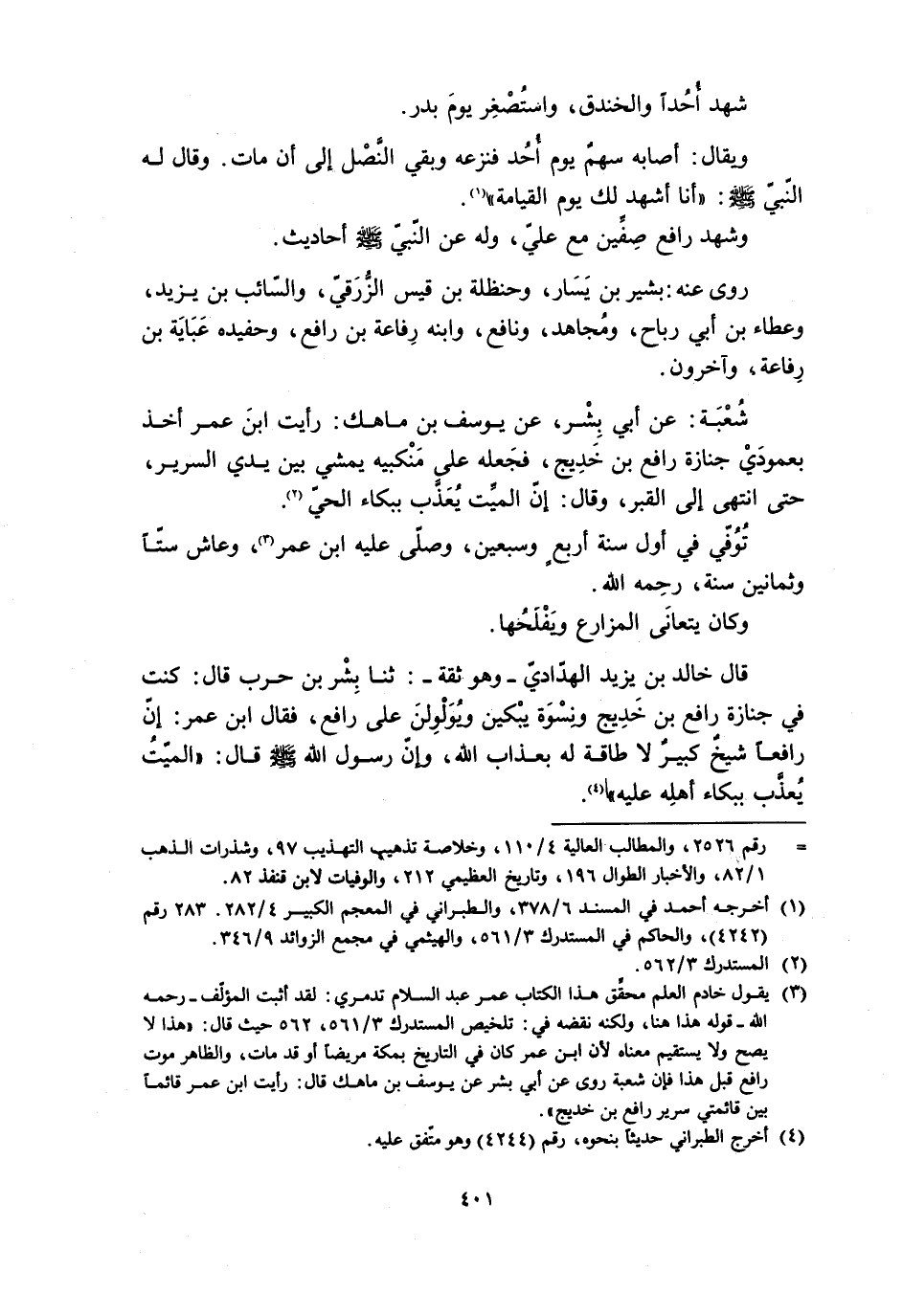قَالَ خَالِدُ بْنُ يَزِيدَ الْهَدَادِيُّ- وَهُوَ ثِقَةٌ-: ثنا بِشْرُ بْنُ حَرْبٍ قَالَ: كُنْتُ فِي جِنَازَةِ رَافِعِ بْنِ خَدِيجٍ وَنِسْوَةُ يَبْكِينَ وَيُوَلْوِلْنَ عَلَى رَافِعٍ، فَقَالَ ابْنُ عُمَرَ: إِنَّ رَافِعًا شَيْخٌ كَبِيرٌ لا طَاقَةَ لَهُ بِعَذَابِ اللَّهِ، وَإِنَّ رَسُولَ اللَّهِ صَلَّى اللَّهُ عَلَيْهِ وَسَلَّمَ قَالَ: «الْمَيِّتُ يُعذَّبُ ببكاء أهله عليه» [4] .