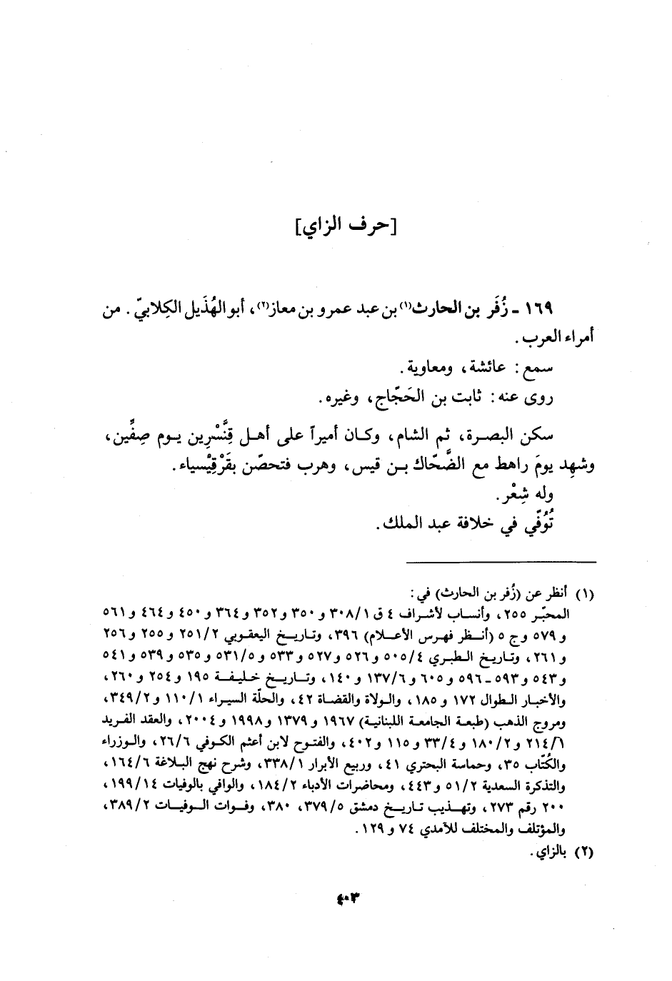 169- زُفَرُ بْنُ الْحَارِثِ [1] بْنِ عَبْدِ عَمْرِو بْنِ معاز [2] ، أَبُو الْهُذَيْلِ الْكِلابِيُّ. مِنْ أُمَرَاءِ الْعَرَبِ.