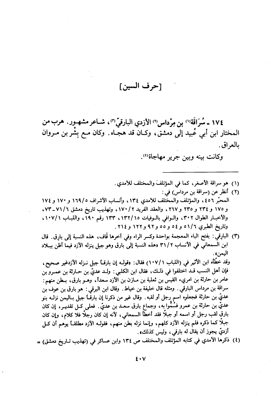 174- سُرَاقَةُ [1] بْنُ مِرْدَاسٍ [2] الأَزْدِيُّ الْبَارِقِيُّ [3] ، شاعر مشهور. هرب من المختار ابن أبي عُبَيْدٍ إِلَى دِمَشْقَ، وَكَانَ قَدْ هَجَاهُ. وَكَانَ مَعَ بِشْرِ بْنِ مَرْوَانَ بِالْعِرَاقِ.