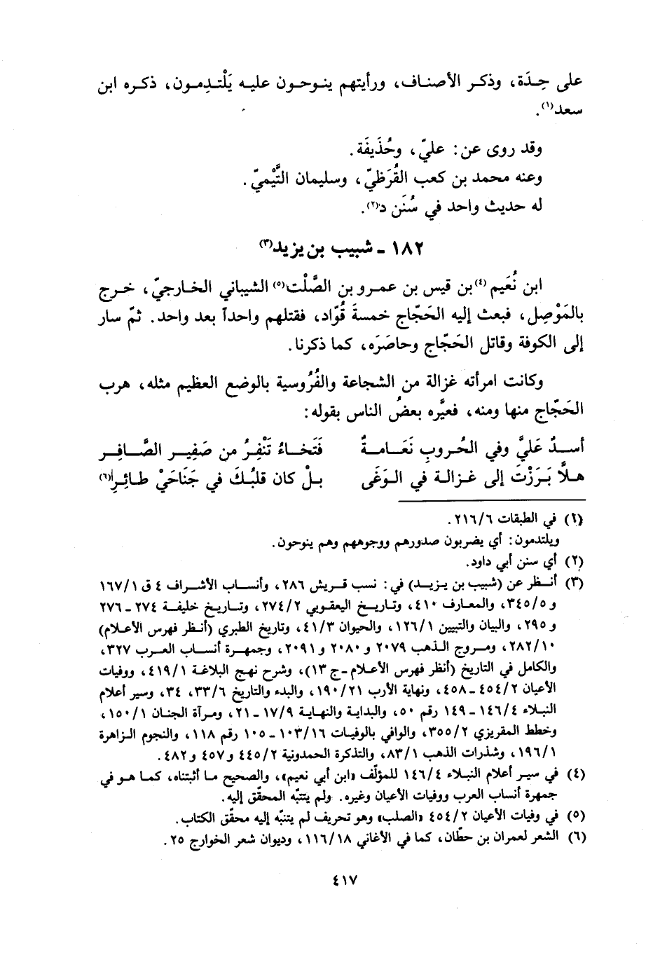 [3] انظر عن (شبيب بن يزيد) في: نسب قريش 286، وأنساب الأشراف 4 ق 1/ 167 و 5/ 345، والمعارف 410، وتاريخ اليعقوبي 2/ 274، وتاريخ خليفة 274- 276 و 295، والبيان والتبيين 1/ 126، والحيوان 3/ 41، وتاريخ الطبري (انظر فهرس الأعلام) 10/ 282، ومروج الذهب 2079 و 2080 و 2091، وجمهرة أنساب العرب 327، والكامل في التاريخ (انظر فهرس الأعلام- ج 13) ، وشرح نهج البلاغة 1/ 419، ووفيات الأعيان 2/ 454- 458، ونهاية الأرب 21/ 190، والبدء والتاريخ 6/ 33، 34، وسير أعلام النبلاء 4/ 146- 149 رقم 50، والبداية والنهاية 9/ 17- 21، ومرآة الجنان 1/ 150، وخطط المقريزي 2/ 355، والوافي بالوفيات 16/ 103- 105 رقم 118، والنجوم الزاهرة 1/ 196، وشذرات الذهب 1/ 83، والتذكرة الحمدونية 2/ 445 و 457 و 482.