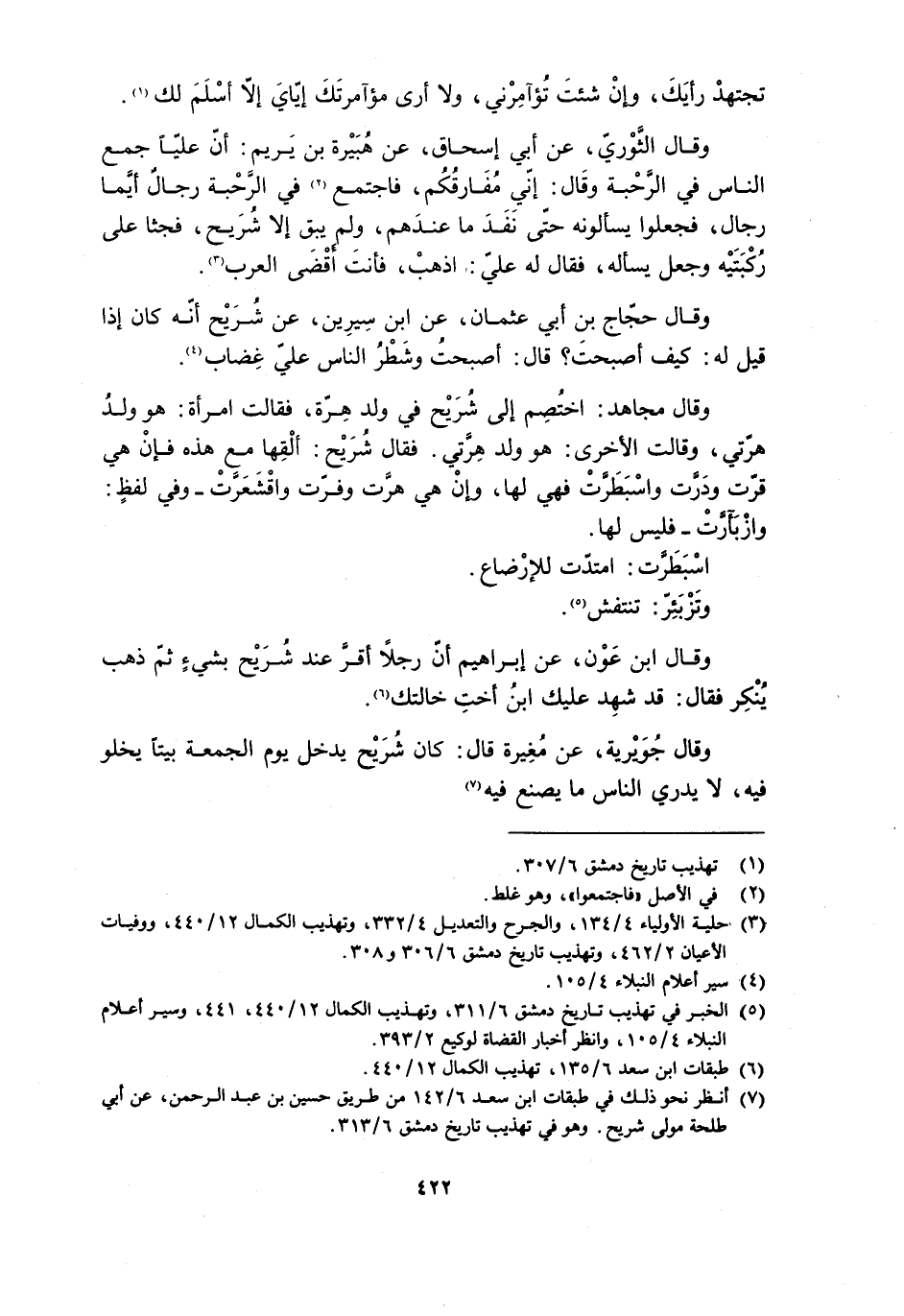 [7] انظر نحو ذلك في طبقات ابن سعد 6/ 142 من طريق حسين بن عبد الرحمن، عن أبي طلحة مولى شريح. وهو في تهذيب تاريخ دمشق 6/ 313.