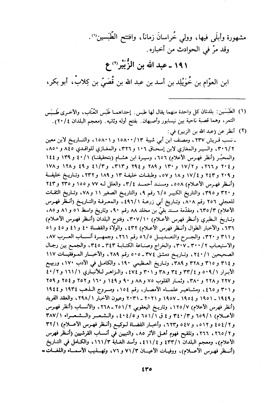 - نسب قريش 237، ومصنف ابن أبي شيبة 13/ 15800 و 15801، والتاريخ لابن معين 2/ 306، والسير والمغازي لابن إسحاق 106 و 326، والمغازي للواقدي 845 و 850، والمحبّر (انظر فهرس الأعلام) 656، وسيرة ابن هشام (بتحقيقنا) 1/ 40 و 139 و 144 و 204 و 266 و 2/ 17 و 130 و 289 و 294 و 313، و 3/ 41 و 49 و 128 و 178 و 209 و 243 و 4/ 17 و 18 و 57، وطبقات خليفة 13 و 189 و 232، وتاريخ خليفة (انظر فهرس الأعلام) 558، ومسند أحمد 4/ 3، والعلل له 77 و 155 و 235 و 243 و 320 و 395، والتاريخ الكبير 5/ 6 رقم 9، والتاريخ الصغير 11 و 78، وتاريخ الثقات للعجلي 256 رقم 808، وتاريخ أبي زرعة 1/ 496، والمعرفة والتاريخ (انظر فهرس الأعلام) 3/ 635، ومقدّمة مسند بقيّ بن مخلد 88 رقم 90، وتاريخ واسط 51 و 81 و 85، وتاريخ الطبري (انظر فهرس الأعلام) 10/ 307، وفتوح البلدان (انظر فهرس الأعلام) 636، والأخبار الطوال (انظر فهرس الأعلام) 432، والولاة والقضاة 40 و 41 و 45 و 51 و 311 و 320، والجرح والتعديل 5/ 56 رقم 261، وجمهرة أنساب العرب 87، والاستيعاب 2/ 300- 307، والخراج وصناعة الكتابة 343- 345، والجمع بين رجال الصحيحين 1/ 240، وتاريخ دمشق 374- 505 رقم 289، والأخبار الموفقيات 117 و 314 و 315 و 328 و 389، وتاريخ العظيمي 190، والكامل في الأدب 170، وربيع الأبرار 1/ 509 و 4/ 33 و 34 و 38 و 301 و 474، والزاهر للأنباري 1/ 161 و 2/ 40 و 227 و 228 و 380، وثمار القلوب 75 و 88 و 90 و 149 و 160 و 252 و 254 و 259 و 301 و 465، ومشاهير علماء الأمصار، رقم 154، ومروج الذهب 1934 و 1944 و 1949- 1951 و 1954- 1957 و 2021- 2031 وعيون الأخبار 1/ 298، والعقد الفريد (انظر فهرس الأعلام) 7/ 125، وتاريخ اليعقوبي 2/ 251- 268، والأنساب (انظر فهرس الأعلام) 1/ 659 و 3/ 340 و 4 ق 1/ 651 و 5/ 404، والشعر والشعراء 1/ 387 و 2/ 454 و 512، و 547 و 623، وأخبار القضاة لوكيع (انظر فهرس الأعلام) 1/ 32 و 2/ 265، 266، وتلقيح فهوم أهل الأثر 85، والتبيين في أنساب القرشيين (انظر فهرس الأعلام) ، ومعجم البلدان 1/ 433 و 4/ 411، وأسد الغابة 3/ 161، والكامل في التاريخ (انظر فهرس الأعلام) ، ووفيات الأعيان 3/ 71 و 76، وتهذيب الأسماء واللغات