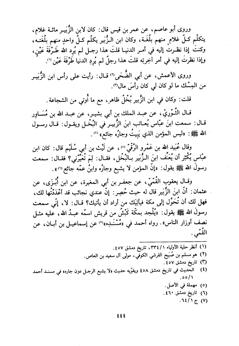 قَالَ الثَّوْرِيُّ، عَنْ عَبْدِ الْمَلِكِ بْنِ أَبِي بَشِيرٍ، عَنْ عَبْدِ اللَّهِ بْنِ مُسَاوِرٍ قَالَ: سَمِعْتُ ابْنَ عَبَّاسٍ يُعَاتِبُ ابْنَ الزُّبَيْرِ فِي الْبُخْلِ وَيَقُولُ: قَالَ رَسُولُ اللَّهِ صَلَّى اللَّهُ عَلَيْهِ وَسَلَّمَ: «لَيْسَ الْمُؤْمِنُ الَّذِي يَبِيتُ وَجَارُهُ جَائِعٌ» [4] . وَقَالَ عُبَيْدُ اللَّهِ بْنُ عَمْرٍو الرَّقِّيُّ [5] ، عَنْ لَيْثِ بْنِ أَبِي سُلَيْمٍ قَالَ: كَانَ ابْنُ عَبَّاسٍ يُكْثِرُ أَنْ يُعَنِّفَ ابْنَ الزُّبَيْرِ بِالْبُخْلِ، فَقَالَ: لِمَ تُعَيِّرُنِي؟ فَقَالَ: سَمِعْتُ رَسُولَ اللَّهِ صَلَّى اللَّهُ عَلَيْهِ وَسَلَّمَ يَقُولُ: «إِنَّ الْمُؤْمِنَ لا يَشْبَعُ وَجَارُهُ وَابْنُ عَمِّهِ جَائِعٌ [6) » ] . وَقَالَ يَعْقُوبُ الْقُمِّيُّ، عَنْ جَعْفَرِ بْنِ أَبِي الْمُغِيرَةَ، عَنِ ابْنِ أَبْزَى، عَنْ عُثْمَانَ: أَنَّ ابْنَ الزُّبَيْرِ قَالَ لَهُ حَيْثُ حُصِرَ: إِنَّ عِنْدِي نَجَائِبَ قَدْ أَعْدَدْتُهَا لَكَ، فَهَلْ لَكَ أَنْ تُحَوِّلَ إِلَى مَكَّةَ فَيَأْتِيَكَ مَنْ أَرَادَ أَنْ يَأْتِيَكَ؟ قَالَ: لا، إِنِّي سَمِعْتُ رَسُولَ اللَّهِ صَلَّى اللَّهُ عَلَيْهِ وَسَلَّمَ يَقُولُ: «يُلْحَدُ بِمَكَّةَ كَبْشٌ مِنْ قُرَيْشٍ اسْمُهُ عَبْدُ اللَّهِ، عَلَيْهِ مِثْلُ نِصْفِ أَوْزَارِ النَّاسِ» . رَوَاهُ أَحْمَدُ فِي «مُسْنَدِهِ» [7] عَنْ إِسْمَاعِيلَ بن أبان، عن القمّي.