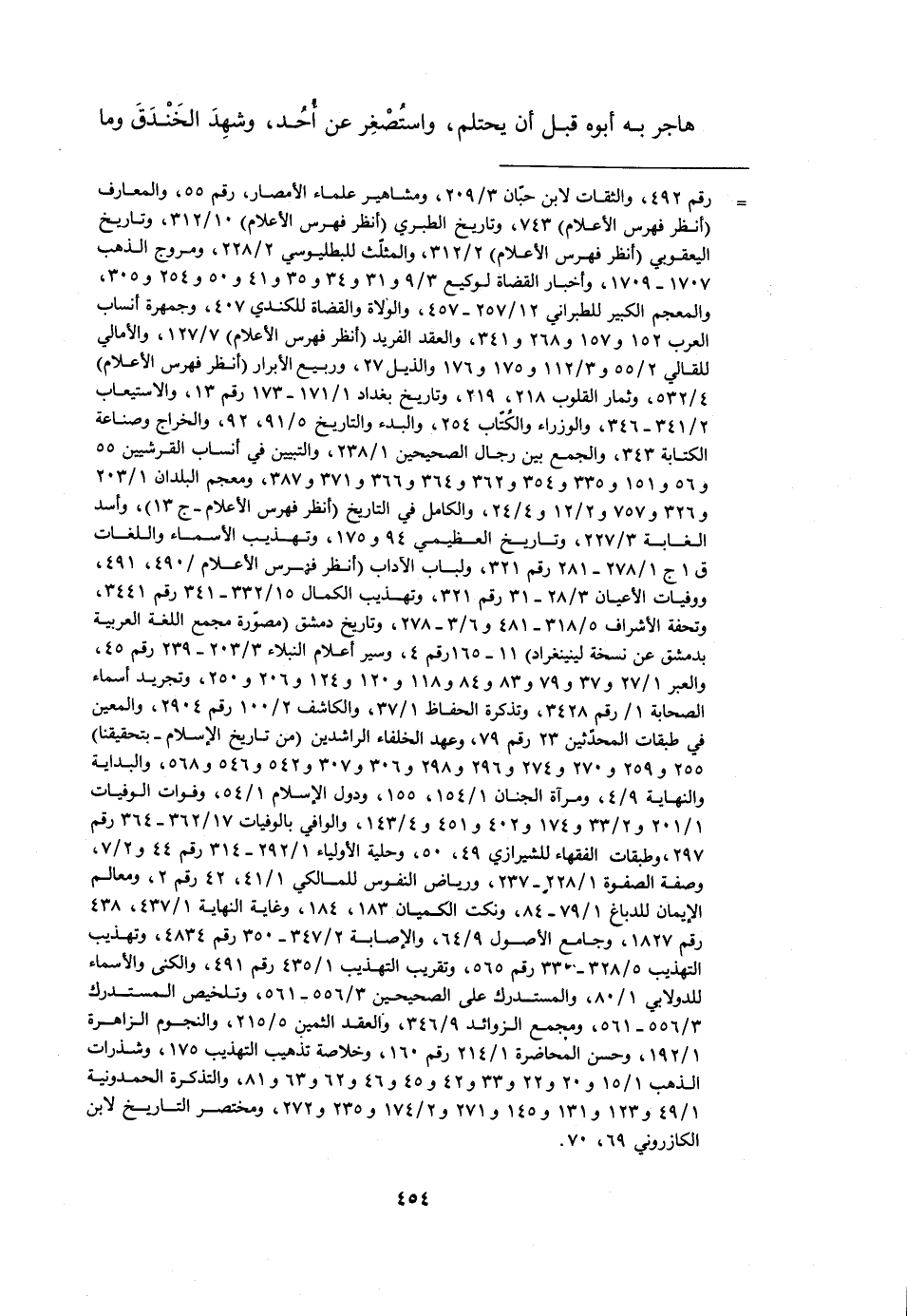 [ () ] رقم 492، والثقات لابن حبّان 3/ 209، ومشاهير علماء الأمصار، رقم 55، والمعارف (انظر فهرس الأعلام) 743، وتاريخ الطبري (انظر فهرس الأعلام) 10/ 312، وتاريخ اليعقوبي (انظر فهرس الأعلام) 2/ 312، والمثلّث للبطليوسي 2/ 228، ومروج الذهب 1707- 1709، وأخبار القضاة لوكيع 3/ 9 و 31 و 34 و 35 و 41 و 50 و 254 و 305، والمعجم الكبير للطبراني 12/ 257- 457، والولاة والقضاة للكندي 407، وجمهرة أنساب العرب 152 و 157 و 268 و 341، والعقد الفريد (انظر فهرس الأعلام) 7/ 127، والأمالي للقالي 2/ 55 و 3/ 112 و 175 و 176 والذيل 27، وربيع الأبرار (انظر فهرس الأعلام) 4/ 532، وثمار القلوب 218، 219، وتاريخ بغداد 1/ 171- 173 رقم 13، والاستيعاب 2/ 341- 346، والوزراء والكتّاب 254، والبدء والتاريخ 5/ 91، 92، والخراج وصناعة الكتابة 343، والجمع بين رجال الصحيحين 1/ 238، والتبيين في أنساب القرشيين 55 و 56 و 151 و 335 و 354 و 362 و 364 و 366 و 371 و 387، ومعجم البلدان 1/ 203 و 326 و 757 و 2/ 12 و 4/ 24، والكامل في التاريخ (انظر فهرس الأعلام- ج 13) ، وأسد الغابة 3/ 227، وتاريخ العظيمي 94 و 175، وتهذيب الأسماء واللغات ق 1 ج 1/ 278- 281 رقم 321، ولباب الآداب (انظر فهرس الأعلام/ 490، 491، ووفيات الأعيان 3/ 28- 31 رقم 321، وتهذيب الكمال 15/ 332- 341 رقم 3441، وتحفة الأشراف 5/ 318- 481 و 6/ 3- 278، وتاريخ دمشق (مصوّرة مجمع اللغة العربية بدمشق عن نسخة لينينغراد) 11- 165 رقم 4، وسير أعلام النبلاء 3/ 203- 239 رقم 45، والعبر 1/ 27 و 37 و 79 و 83 و 84 و 118 و 120 و 124 و 206 و 250، وتجريد أسماء الصحابة 1/ رقم 3428، وتذكرة الحفاظ 1/ 37، والكاشف 2/ 100 رقم 2904، والمعين في طبقات المحدّثين 23 رقم 79، وعهد الخلفاء الراشدين (من تاريخ الإسلام- بتحقيقنا) 255 و 259 و 270 و 274 و 296 و 298 و 306 و 307 و 542 و 546 و 568، والبداية والنهاية 9/ 4، ومرآة الجنان 1/ 154، 155، ودول الإسلام 1/ 54، وفوات الوفيات 1/ 201 و 2/ 33 و 174 و 402 و 451 و 4/ 143، والوافي بالوفيات 17/ 362- 364 رقم 297، وطبقات الفقهاء للشيرازي 49، 50، وحلية الأولياء 1/ 292- 314 رقم 44 و 2/ 7، وصفة الصفوة 1/ 228- 237، ورياض النفوس للمالكي 1/ 41، 42 رقم 2، ومعالم الإيمان للدبّاغ 1/ 79- 84، ونكت الهميان 183، 184، وغاية النهاية 1/ 437، 438 رقم 1827، وجامع الأصول 9/ 64، والإصابة 2/ 347- 350 رقم 4834، وتهذيب التهذيب 5/ 328- 330 رقم 565، وتقريب التهذيب 1/ 435 رقم 491، والكنى والأسماء للدولابي 1/ 80، والمستدرك على الصحيحين 3/ 556- 561، وتلخيص المستدرك 3/ 556- 561، ومجمع الزوائد 9/ 346، والعقد الثمين 5/ 215، والنجوم الزاهرة 1/ 192، وحسن المحاضرة 1/ 214 رقم 160، وخلاصة تذهيب التهذيب 175، وشذرات الذهب 1/ 15 و 20 و 22 و 33 و 42 و 45 و 46 و 62 و 63 و 81، والتذكرة الحمدونية 1/ 49 و 123 و 131 و 145 و 271 و 2/ 174 و 235 و 272، ومختصر التاريخ لابن الكازروني 69، 70.