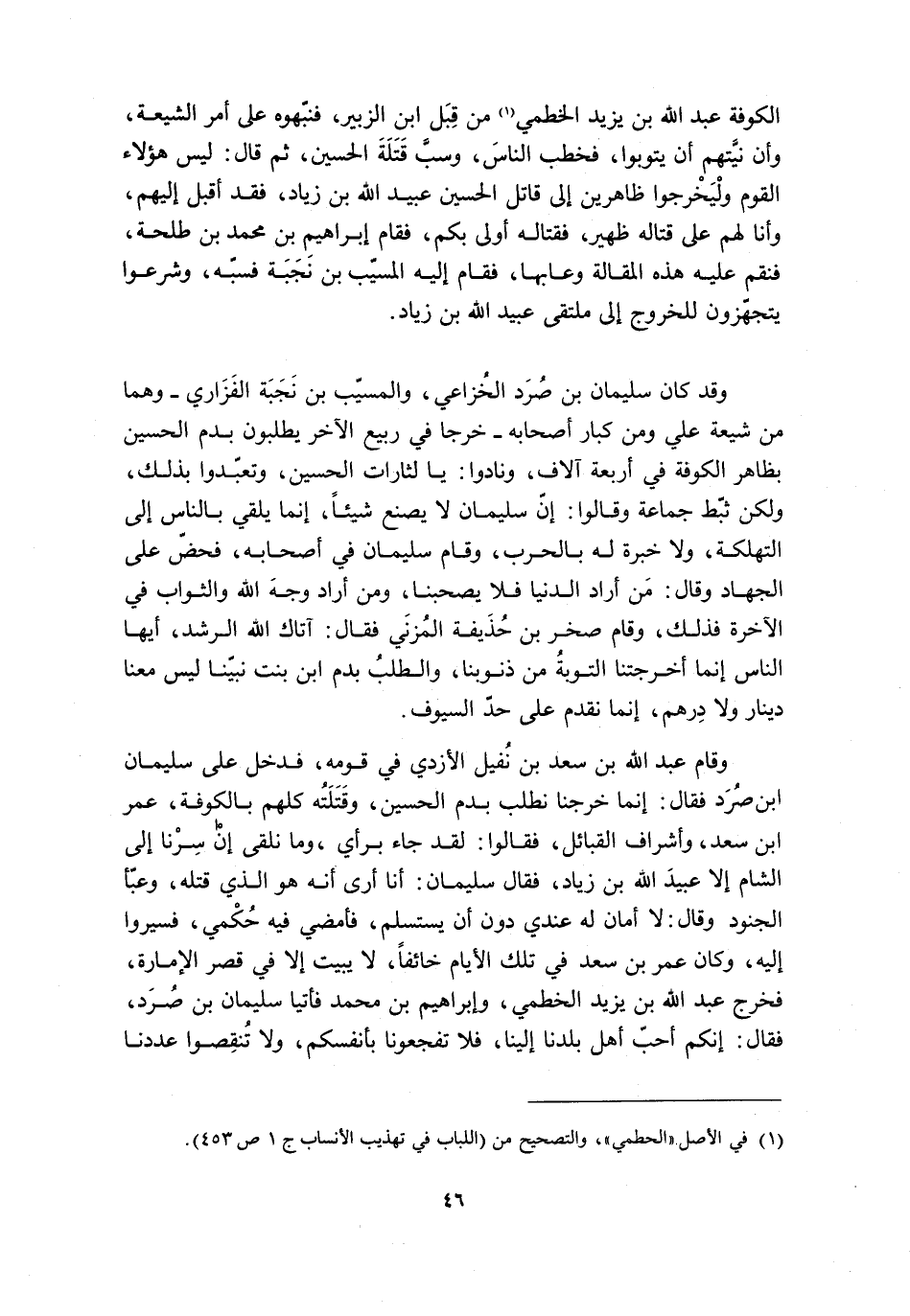 وَقَدْ كَانَ سُلَيْمَان بْنُ صُرَدَ الْخُزَاعِيُّ، وَالْمُسَيَّبُ بْنُ نَجَبَةَ الْفَزَارِيُّ- وَهُمَا مِنْ شِيعَةِ عَلِيٍّ وَمِنْ كِبَارِ أَصْحَابِهِ- خَرَجَا فِي رَبِيعِ الْآخَرَ يَطْلُبُونَ بِدَمِ الْحُسَيْنِ بِظَاهِرِ الْكُوفَةِ فِي أَرْبَعَةِ آلَافٍ، وَنَادَوْا: يَا لِثَارَاتِ الْحُسَيْنِ، وَتَعَبَّدُوا بِذَلِكَ، وَلَكِنْ ثَبَّطَ جَمَاعَةٌ وَقَالُوا: إِنَّ سُلَيْمَانَ لَا يَصْنَعُ شَيْئًا، إِنَّمَا يُلْقِي بِالنَّاسِ إِلَى التَّهْلُكَةِ، وَلَا خِبْرَةَ لَهُ بِالْحَرْبِ، وَقَامَ سُلَيْمَانُ فِي أَصْحَابِهِ، فَحَضَّ عَلَى الْجِهَادِ وَقَالَ: مَنْ أَرَادَ الدُّنْيَا فَلَا يَصَحَبْنَا، وَمَنْ أَرَادَ وَجْهَ اللَّهِ وَالثَّوَابَ فِي الْآخِرَةِ فَذَلِكَ، وَقَامَ صَخْرُ بْنُ حُذَيْفَةَ الْمُزَنِيُّ فَقَالَ: آتَاكَ اللَّهُ الرُّشْدَ، أَيُّهَا النَّاسُ إِنَّمَا أَخْرَجَتْنَا التَّوْبَةُ مِنْ ذُنُوبِنَا، وَالطَّلَبُ بِدَمِ ابْنِ بِنْتِ نَبِيِّنَا لَيْسَ مَعَنَا دِينَارٌ وَلَا دِرْهَمٌ، إِنَّمَا نُقْدِمُ عَلَى حَدِّ السُّيُوفِ.
