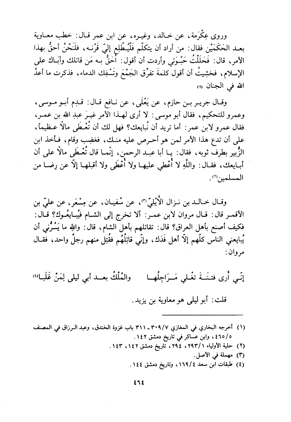 وَرَوَى عِكْرِمَةُ، عَنْ خَالِدٍ، وَغَيْرُهُ، عَنِ ابْنِ عُمَرَ قَالَ: خَطَبَ مُعَاوِيَةُ بَعْدَ الْحَكَمَيْنِ فَقَالَ: مَنْ أَرَادَ أَنْ يَتَكَلَّمَ فَلْيُطُلِعْ إِلَيَّ قَرْنَهُ، فَلَنَحْنُ أَحَقُّ بِهَذَا الأَمْرِ، قَالَ: فَحَلَلْتُ حَبْوَتِي وَأَرَدْتُ أَنْ أَقُولَ: أَحَقُّ بِهِ مَنْ قَاتَلَكَ وأباك على الإسلام، فخشيت أن أقول كلمة تُفَرِّقُ الْجَمْعَ وَتُسْفِكُ الدِّمَاءَ، فَذَكَرْتُ مَا أَعَدَّ اللَّهُ فِي الْجِنَانِ [1] .