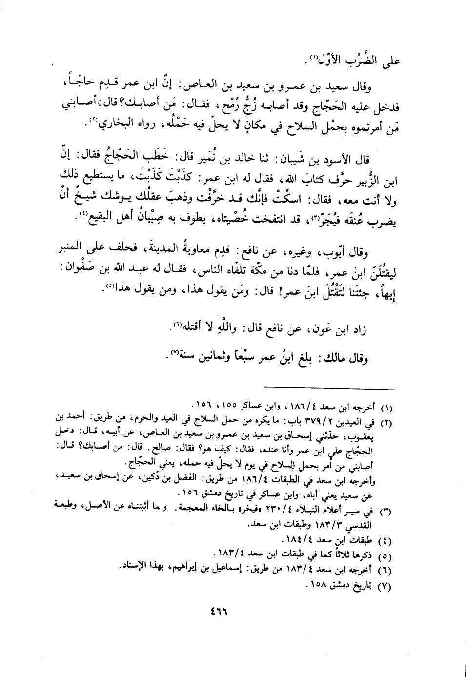 [2] في العيدين 2/ 379 باب: ما يكره من حمل السلاح في العيد والحرم، من طريق: أحمد بن يعقوب، حدّثني إسحاق بْنُ سَعِيدُ بْنُ عَمْرِو بْنِ سَعِيدِ بْنِ الْعَاصِ، عن أبيه، قال: دخل الحجّاج على ابن عمر وأنا عنده، فقال: كيف هو؟ فقال: صالح. قال: من أصابك؟ قال: