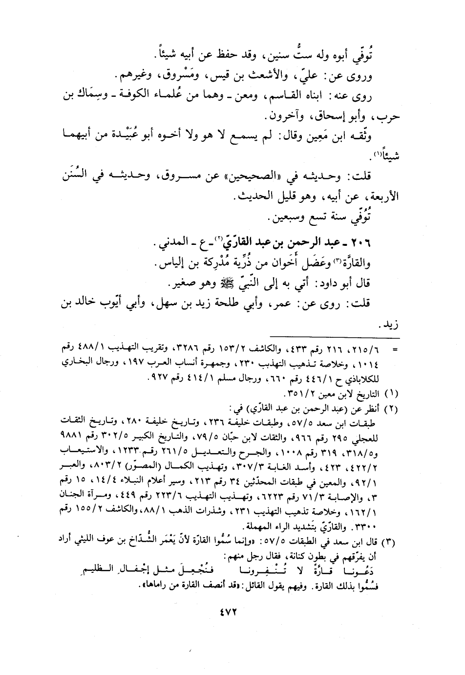 طبقات ابن سعد 5/ 57، وطبقات خليفة 236، وتاريخ خليفة 280، وتاريخ الثقات للعجلي 295 رقم 966، والثقات لابن حبّان 5/ 79، والتاريخ الكبير 5/ 302 رقم 9881 و 5/ 318، 319 رقم 1008، والجرح والتعديل 5/ 261 رقم 1233، والاستيعاب 2/ 422، 423، وأسد الغابة 3/ 307، وتهذيب الكمال (المصوّر) 2/ 803، والعبر 1/ 92، والمعين في طبقات المحدّثين 34 رقم 213، وسير أعلام النبلاء 4/ 14، 15 رقم 3، والإصابة 3/ 71 رقم 6223، وتهذيب التهذيب 6/ 223 رقم 449، ومرآة الجنان 1/ 162، وخلاصة تذهيب التهذيب 231، وشذرات الذهب 1/ 88، والكاشف 2/ 155 رقم 3300. والقارّيّ بتشديد الراء المهملة.