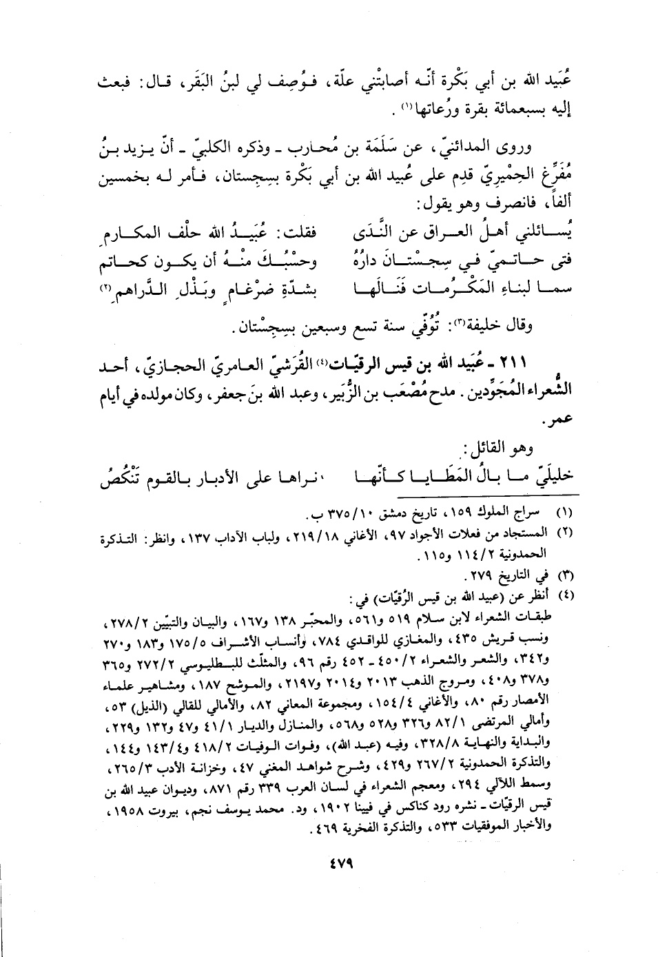 211- عُبَيْدُ اللَّهِ بْنُ قَيْسٍ الرُّقَيَّاتِ [4] الْقُرَشِيُّ الْعَامِرِيُّ الْحِجَازِيُّ، أَحَدُ الشُّعَرَاءِ الْمُجَوِّدِينَ. مَدَحَ مُصْعَبَ بْنَ الزُّبَيْرِ، وَعَبْدَ اللَّهِ بْنَ جَعْفَرٍ، وَكَانَ مَوْلِدُهُ فِي أَيَّامِ عُمَرَ.