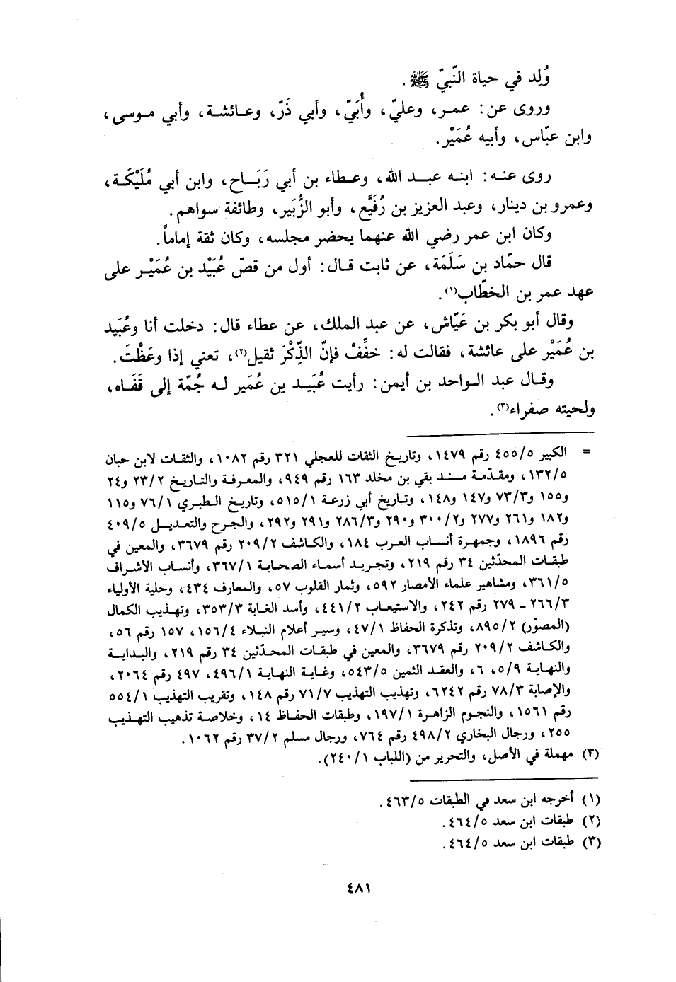 [ () ] الكبير 5/ 455 رقم 1479، وتاريخ الثقات للعجلي 321 رقم 1082، والثقات لابن حبان 5/ 132، ومقدّمة مسند بقي بن مخلد 163 رقم 949، والمعرفة والتاريخ 2/ 23 و 24 و 155 و 3/ 73 و 147 و 148، وتاريخ أبي زرعة 1/ 515، وتاريخ الطبري 1/ 76 و 115 و 182 و 261 و 277 و 2/ 300 و 290 و 3/ 286 و 291 و 292، والجرح والتعديل 5/ 409 رقم 1896، وجمهرة أنساب العرب 184، والكاشف 2/ 209 رقم 3679، والمعين في طبقات المحدّثين 34 رقم 219، وتجريد أسماء الصحابة 1/ 367، وأنساب الأشراف 5/ 361، ومشاهير علماء الأمصار 592، وثمار القلوب 57، والمعارف 434، وحلية الأولياء 3/ 266- 279 رقم 242، والاستيعاب 2/ 441، وأسد الغابة 3/ 353، وتهذيب الكمال (المصوّر) 2/ 895، وتذكرة الحفاظ 1/ 47، وسير أعلام النبلاء 4/ 156، 157 رقم 56، والكاشف 2/ 209 رقم 3679، والمعين في طبقات المحدّثين 34 رقم 219، والبداية والنهاية 9/ 5، 6، والعقد الثمين 5/ 543، وغاية النهاية 1/ 496، 497 رقم 2064، والإصابة 3/ 78 رقم 6242، وتهذيب التهذيب 7/ 71 رقم 148، وتقريب التهذيب 1/ 554 رقم 1561، والنجوم الزاهرة 1/ 197، وطبقات الحفاظ 14، وخلاصة تذهيب التهذيب 255، ورجال البخاري 2/ 498 رقم 764، ورجال مسلم 2/ 37 رقم 1062.