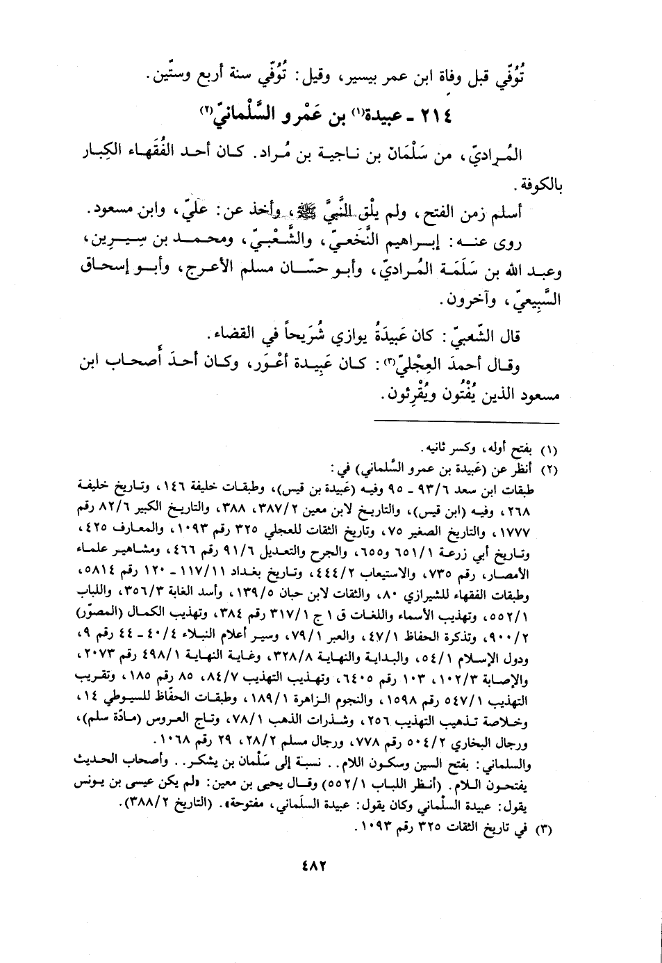 214- عَبِيدَةُ [1] بْنُ عَمْرٍو السّلمانيّ [2] المراديّ، من سَلْمَانَ بْنِ نَاجِيَةَ بْنِ مُرَادٍ. كَانَ أَحَدَ الْفُقَهَاءِ الْكِبَارِ بِالْكُوفَةِ.