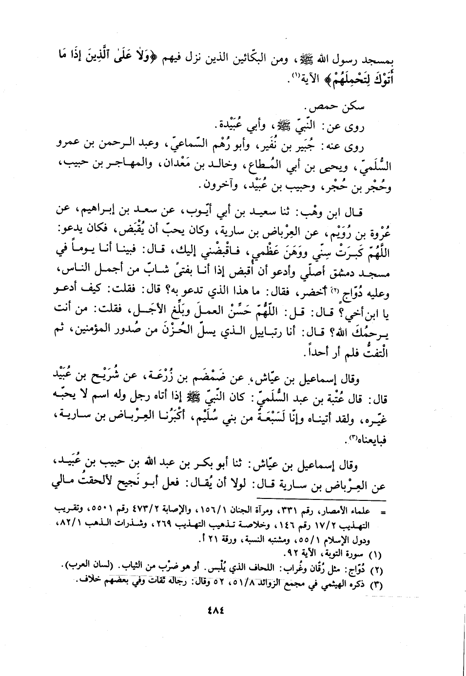 وَقَالَ إِسْمَاعِيلُ بْنُ عَيَّاشٍ: ثنا أَبُو بَكْر بْنُ عَبْدِ اللَّهِ بْنِ حَبِيبِ بْنِ عُبَيْدٍ، عَنِ الْعِرْبَاضِ بْنِ سَارِيَةَ قَالَ: لَوْلا أَنْ يُقَالَ: فَعَلَ أَبُو نجيح لألحقت مالي