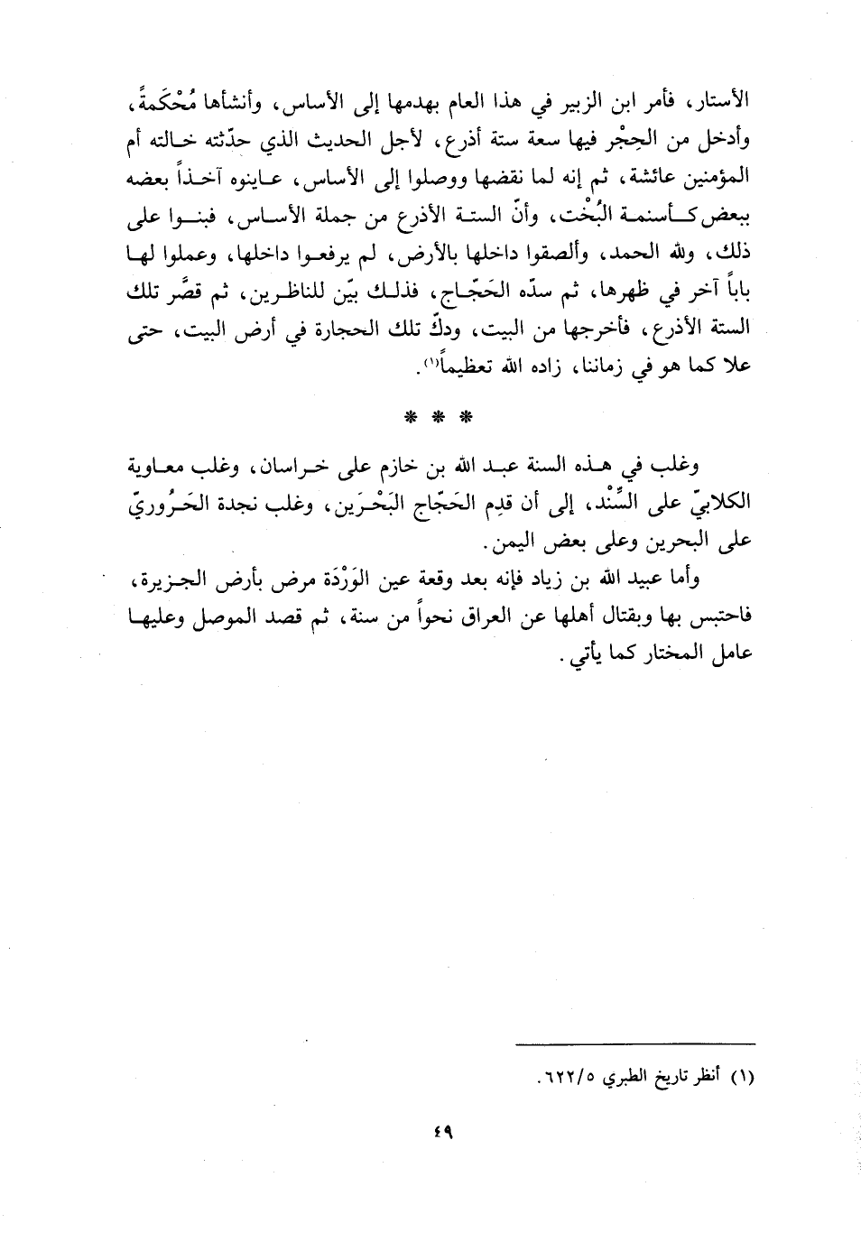 الْأَسْتَارِ، فَأَمَر ابْنُ الزُّبَيْرِ فِي هَذَا الْعَامِ بِهَدْمِهَا إِلَى الْأَسَاسِ، وَأَنْشَأَهَا مُحْكَمَةً، وَأَدْخَلَ مِنَ الْحِجْرِ فِيهَا سِعَةَ سِتَّةِ أَذْرُعٍ، لِأَجْلِ الْحَدِيثِ الَّذِي حَدَّثَتْهُ خَالَتُهُ أُمُّ الْمُؤْمِنِينَ عَائِشَةُ، ثُمَّ إِنَّهُ لَمَّا نَقَضَهَا وَوَصَلُوا إِلَى الْأَسَاسِ، عَايَنُوهُ آخِذًا بَعْضَهُ بِبَعْضٍ كَأَسْنِمَةِ الْبُخْتِ، وَأَنَّ السِّتَّةَ الْأَذْرُعَ مِنْ جُمْلَةِ الْأَسَاسِ، فَبَنَوْا عَلَى ذَلِكَ، وللَّه الْحَمْدُ، وَأَلْصَقُوا دَاخِلَهَا بِالْأَرْضِ، لَمْ يَرْفَعُوا دَاخِلَهَا، وَعَمِلُوا لَهَا بَابًا آخَرَ فِي ظَهْرِهَا، ثُمَّ سَدَّهُ الْحَجَّاجُ، فَذَلِكَ بَيِّنٌ لِلنَّاظِرِينَ، ثُمَّ قَصَّرَ تِلْكَ السِّتَّةَ الْأَذْرُعَ، فَأَخْرَجَهَا مِنَ الْبَيْتِ، وَدَكَّ تِلْكَ الْحِجَارَةَ فِي أَرْضِ الْبَيْتِ، حَتَّى عَلَا كَمَا هُوَ فِي زَمَانِنَا، زَادَهُ اللَّهُ تَعْظِيمًا [1] .