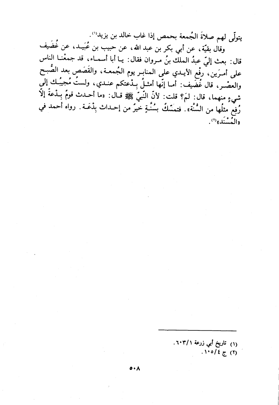 وَقَالَ بَقِيَّةُ، عَنْ أَبِي بَكْرِ بْنِ عَبْدِ اللَّهِ، عَنْ حَبِيبِ بْنِ عُبَيْدٍ، عَنْ غُضَيْفٍ قَالَ: بَعَثَ إِلَيَّ عَبْدُ الْمَلِكِ بْنُ مَرْوَانَ فَقَالَ: يَا أَبَا أَسْمَاءَ، قَدْ جَمَعْنَا النَّاسَ عَلَى أَمْرَيْنِ، رَفْعِ الأَيْدِي عَلَى الْمَنَابِرِ يَوْمَ الْجُمُعَةِ، وَالْقَصَصِ بَعْدَ الصُّبْحِ وَالْعَصْرِ، قَالَ غُضَيْفٌ: أَمَّا إِنَّهَا أَمْثَلُ بِدْعَتِكُمْ عِنْدِي، وَلَسْتُ مُجِيبُكَ إِلَى شَيْءٍ مِنْهُمَا، قَالَ: لِمَ؟ قُلْتُ: لِأَنَّ النَّبِيَّ صَلَّى اللَّهُ عَلَيْهِ وَسَلَّمَ قَالَ: «مَا أَحْدَثَ قَوْمٌ بِدْعَةً إِلا رُفِعَ مِثْلُهَا مِنَ السُّنَّةِ» . فَتَمَسُّكٌ بِسُّنَّةٍ خَيْرٌ مِنْ إِحْدَاثِ بِدْعَةٍ. رَوَاهُ أَحْمَدُ فِي «الْمُسْنَدِ» [2] .