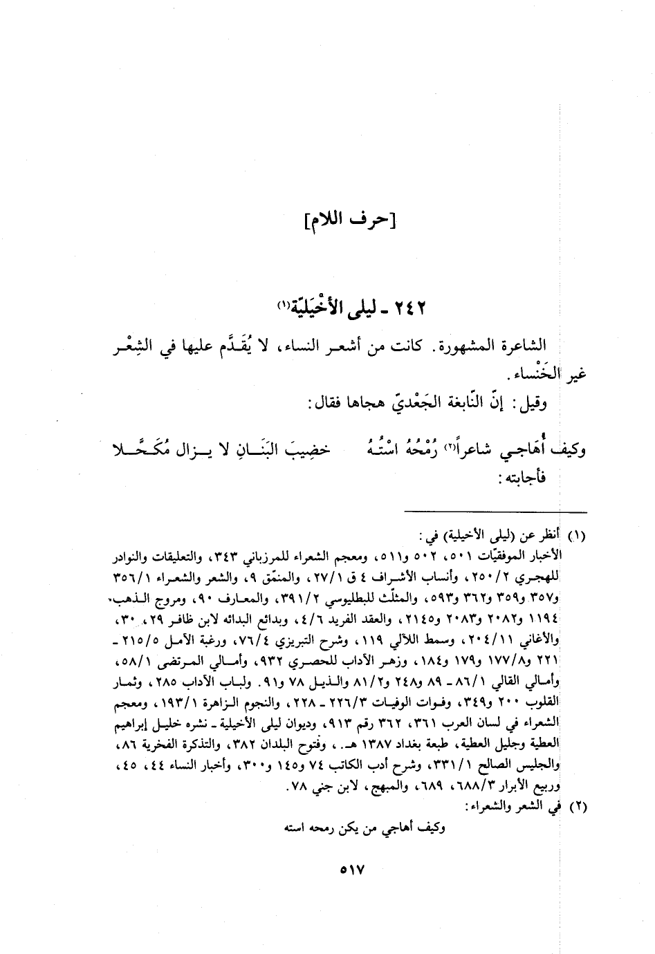 242- ليلى الأخيلية [1] الشاعرة المشهورة. كانت من أشعر النساء، لا يُقَدَّمُ عَلَيْهَا فِي الشِّعْرِ غَيْرَ الْخَنْسَاءِ.