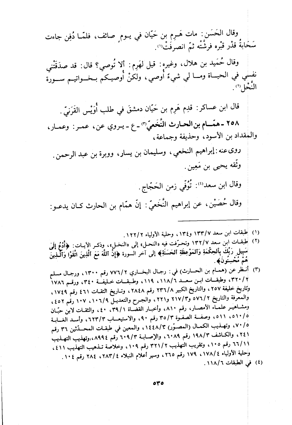258- هَمَّامُ بْنُ الْحَارِثِ النَّخَعِيُّ [3]- ع- يَرْوِي عَنْ، عُمَرَ: وَعَمَّارٍ، وَالْمِقْدَادِ بْنِ الأَسْوَدِ، وَحُذَيْفَةَ وَجَمَاعَةٍ، رَوَى عَنْهُ: إِبْرَاهِيمُ النَّخَعِيُّ، وَسُلَيْمَانُ بْنُ يَسَارٍ، وَوَبَرَةُ بْنُ عَبْدِ الرَّحْمَنِ.