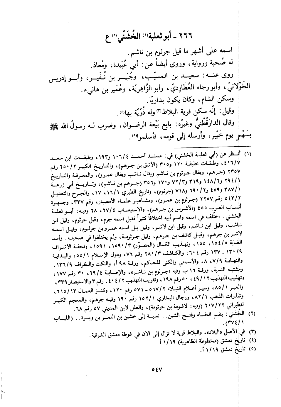 [1] انظر عن (أبي ثعلبة الخشنيّ) في: مسند أحمد 4/ 106 و 193، وطبقات ابن سعد 7/ 416، وطبقات خليفة 120 و 305 (الأشق بن جرهم) ، والتاريخ الكبير 2/ 250 رقم 2357 (جرهم، ويقال جرثوم بن ناشم ويقال ناشب ويقال عمرو) ، والمعرفة والتاريخ 1/ 294 و 2/ 148 و 319 و 3/ 72 و 170 و 356 (جرهم بن ناشم) ، وتاريخ أبي زرعة 1/ 387 و 459 و 2/ 690 و 718 (جرثوم) ، وتاريخ الطبري 1/ 16، 17، والجرح والتعديل 2/ 543 رقم 2257 (جرثوم بن عمرو) ، ومشاهير علماء الأمصار، رقم 337، وجمهرة أنساب العرب 455 (الأشرس بن جرهم) ، والاستيعاب 4/ 27، 28 وفيه: أبو ثعلبة الخشنيّ. اختلف في اسمه واسم أبيه اختلافا كثيرا فقيل اسمه جرم، وقيل جرثوم، وقيل ابن ناشب، وقيل ابن ناشم، وقيل ابن لاشر، وقيل بل اسمه عمرو بن جرثوم، وقيل اسمه لاشر بن جرهم، وقيل كاشف بن جرهم، وقيل جرثومة، ولم يختلفوا في صحبته. وأسد الغابة 5/ 154، 155، وتهذيب الكمال (المصوّر) 3/ 1590، 1591، وتحفة الأشراف 9/ 130- 137 رقم 604، والكاشف 3/ 281 رقم 76، ودول الإسلام 1/ 55، والبداية والنهاية 9/ 7، 8، والأسامي والكنى للحاكم، ورقة 98 أ، والنكت والظراف 9/ 136، ومشتبه النسبة، ورقة 16 ب وفيه «جرثوم بن ناشر» ، والإصابة 4/ 29، 30 رقم 177، وتهذيب التهذيب 12/ 49، 50 رقم 198، وتقريب التهذيب 2/ 404، رقم 3 والاستبصار 339، والعبر 1/ 85، وسير أعلام النبلاء 2/ 567- 571 رقم 120، وكنز العمال 13/ 615، وشذرات الذهب 1/ 82، ورجال البخاري 1/ 152 رقم 190 وفيه جرهم، والمعجم الكبير للطبراني 22/ 207 (وفيه: لا شومة بن جرثومة) ، والعلل لابن المديني 57 رقم 68.
