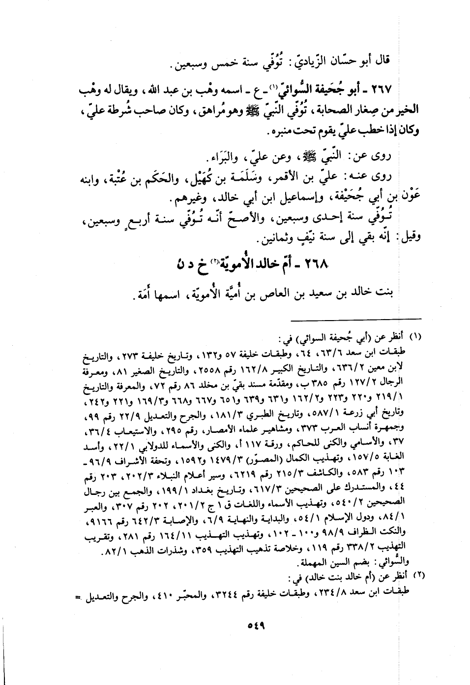 267- أبو جحيفة السّوائيّ [1]- ع- اسمه وهْب بْن عَبْد اللَّهِ، ويقَالَ لَهُ وهب الخير من صغار الصَّحَابَة، تُوُفِّيَ النَّبِيُّ صَلَّى اللَّهُ عَلَيْهِ وَسَلَّمَ وَهُوَ مُراهق، وكَانَ صاحب شُرطة عَلِيّ، وكَانَ إذا خطب عَلِيّ يقوم تحت منبره.