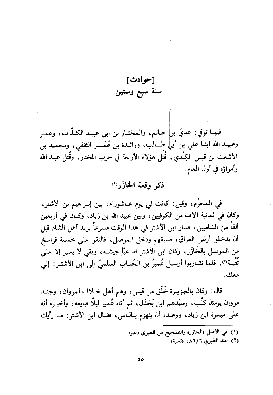 فِي الْمُحَرَّمِ، وَقِيلَ: كَانَتْ فِي يَوْمِ عَاشُورَاءَ، بَيْنَ إِبْرَاهِيمَ بْنِ الْأَشْتَرِ، وَكَانَ فِي ثَمَانِيَةِ آلَافٍ مِنَ الْكُوفِيِّينَ، وَبَيْنَ عُبَيْدِ اللَّهِ بْنِ زِيَادٍ، وَكَانَ فِي أَرْبَعِينَ أَلْفًا مِنَ الشَّامِيِّينَ، فَسَارَ ابْنُ الْأَشْتَرِ فِي هَذَا الْوَقْتِ مُسْرِعًا يُرِيدُ أَهْلَ الشَّامِ قَبْلَ أَنْ يَدْخُلُوا أَرْضِ الْعِرَاقِ، فَسَبَقَهُمْ وَدَخَلَ الْمَوْصِلَ، فَالْتَقَوْا عَلَى خَمْسَةِ فَرَاسِخَ مِنَ الْمَوْصِلِ بِالْخَازَرِ، وَكَانَ ابْنُ الْأَشْتَرِ قَدْ عَبَّأَ جَيْشَهُ، وَبَقِيَ لَا يَسِيرُ إِلَّا عَلَى تُقْيَةٍ [2] ، فَلَمَّا تَقَارَبُوا أَرْسَلَ عُمَيْرُ بْنُ الْحُبَابِ السُّلَمِيُّ إِلَى ابْنِ الْأَشْتَرِ: إِنِّي مَعَكَ.
