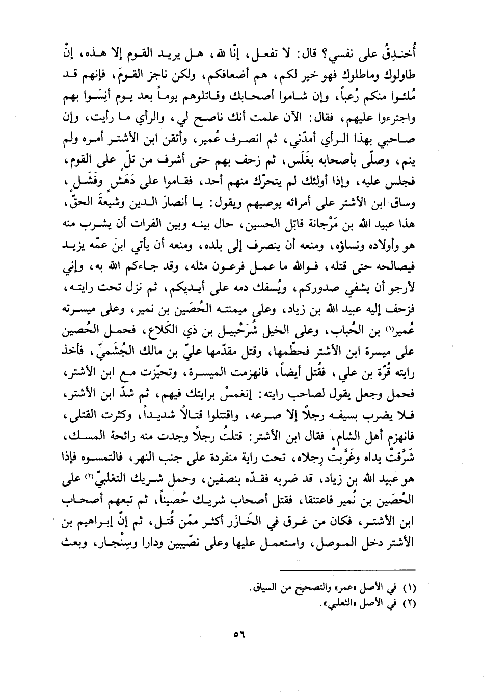 أُخَندِقُ عَلَى نَفْسِي؟ قَالَ: لَا تَفْعَلْ، إِنَّا للَّه، هَلْ يُرِيدُ الْقَوْمُ إِلَّا هَذِهِ، إِنْ طاولوك وما ماطلوك فَهُوَ خَيْرٌ لَكُمْ، هُمْ أَضْعَافُكُمْ، وَلَكِنْ نَاجِزِ الْقَوْمَ، فَإِنَّهُمْ قَدْ مُلِئُوا مِنْكُمْ رُعْبًا، وَإِنْ شَامُوا أَصْحَابَكَ وَقَاتَلُوهُمْ يَوْمًا بَعْدَ يَوْمٍ أَنِسُوا بِهِمْ وَاجْتَرَءُوا عَلَيْهِمْ، فَقَالَ: الْآنَ عَلِمْتُ أَنَّكَ نَاصِحٌ لِي، وَالرَّأْيُ مَا رَأَيْتَ، وَإِنَّ صَاحِبِي بِهَذَا الرَّأْيِ أَمَدَّنِي، ثُمَّ انْصَرَفَ عُمَيْرُ، وَأتْقَنَ ابْنُ الْأَشْتَرِ أَمْرَهُ وَلَمْ يَنَمْ، وَصَلَّى بِأَصْحَابِهِ بِغَلَسٍ، ثُمَّ زَحَفَ بِهِمْ حَتَّى أَشْرَفَ مِنْ تَلٍّ عَلَى الْقَوْمِ، فَجَلَسَ عَلَيْهِ، وَإِذَا أُولَئِكَ لَمْ يَتَحَرَّكْ مِنْهُمْ أَحَدٌ، فَقَامُوا عَلَى دَهَشٍ وَفَشَلٍ، وَسَاقَ ابْنُ الْأَشْتَرِ عَلَى أُمَرَائِهِ يُوصِيهِمْ وَيَقُولُ: يَا أَنْصَارَ الدِّينِ وَشِيعَةَ الْحَقِّ، هَذَا عُبَيْدُ اللَّهِ بْنُ مَرْجَانَةَ قَاتِلُ الْحُسَيْنِ، حَالَ بَيْنَهُ وَبَيْنَ الْفُرَاتِ أَنْ يَشْرَبَ مِنْهُ هُوَ وَأَوْلَادُهُ وَنِسَاؤُهُ، وَمَنَعَهُ أَنْ يَنْصَرِفَ إِلَى بَلَدِهِ، وَمَنَعَهُ أَنْ يَأْتِيَ ابْنَ عَمِّهِ يَزِيدَ فَيُصَالِحُهُ حتى قتله، فو الله مَا عَمِلَ فِرْعَوْنُ مِثْلَهُ، وَقَدْ جَاءَكُمُ اللَّهُ بِهِ، وَإِنِّي لَأَرْجُو أَنْ يَشْفِيَ صُدُورَكُمْ، وَيُسْفِكَ دَمَهُ عَلَى أَيْدِيكُمْ، ثُمَّ نَزَلَ تَحْتَ رَايَتِهِ، فَزَحَفَ إِلَيْهِ عُبَيْدُ اللَّهِ بْنُ زِيَادٍ، وَعَلَى مَيْمَنَتِهِ الْحُصَيْنُ بْنُ نُمَيْرٍ، وَعَلَى مَيْسَرَتِهِ عُمَيْرُ [1] بْنُ الْحُبَابِ، وَعَلَى الْخَيْلِ شُرَحْبِيلُ بْنُ ذِي الْكَلَاعِ، فَحَمَلَ الْحُصَيْنُ عَلَى مَيْسَرَةِ ابْنِ الْأَشْتَرِ فَحَطَّمَهَا، وَقَتَلَ مُقَدِّمَهَا عَلِيُّ بْنُ مَالِكٍ الْجُشَمِيُّ، فَأَخَذَ رَايَتَهُ قُرَّةُ بْنُ عَلِيٍّ، فَقُتِلَ أَيْضًا، فَانْهَزَمَتِ الْمَيِسرَةُ، وَتَحَيَّزَتْ مَعَ ابْنِ الْأَشْتَرِ، فَحَمَلَ وَجَعَلَ يَقُولُ لِصَاحِبِ رَايَتِهِ: انْغَمِسْ بِرَايَتِكَ فِيهِمْ، ثُمَّ شُدَّ ابْنَ الْأَشْتَرِ، فَلَا يَضْرِبُ بِسَيْفِهِ رَجُلًا إِلَّا صَرَعَهُ، وَاقْتَتَلُوا قِتَالًا شَدِيدًا، وَكَثُرَتِ الْقَتْلَى، فَانْهَزَمَ أَهْلُ الشَّامِ، فَقَالَ ابْنُ الْأَشْتَرِ: قَتَلْتُ رَجُلًا وَجَدْتُ مِنْهُ رَائِحَةَ الْمِسْكِ، شَرَّقَتْ يَدَاهُ وَغَرَّبَتْ رِجْلَاهُ، تَحْتَ رَايَةٍ مُنْفَرِدَةٍ عَلَى جَنْبِ النَّهْرِ، فَالْتَمَسُوهُ فَإِذَا هُوَ عُبَيْدُ اللَّهِ بْنُ زِيَادٍ، قَدْ ضَرَبَهُ فَقَدَّهُ بِنِصْفَيْنِ، وَحَمَلَ شَرِيكٌ التَّغْلِبِيُّ [2] عَلَى الْحُصَيْنِ بْنِ نُمَيْرٍ فَاعْتَنَقَا، فَقَتَلَ أَصْحَابُ شَرِيكٍ حُصَيْنًا، ثُمَّ تَبِعَهُمْ أَصْحَابُ ابْنِ الْأَشْتَرِ، فَكَانَ مَنْ غَرِقَ فِي الْخَازَرِ أَكْثَرُ مِمَّنْ قُتِلَ، ثُمَّ إِنَّ إِبْرَاهِيمَ بْنَ الْأَشْتَرِ دَخَلَ الْمَوْصِلَ، وَاسْتُعْمِلَ عَلَيْهَا وَعَلَى نَصِيبِينَ ودارا وسنجار، وبعث