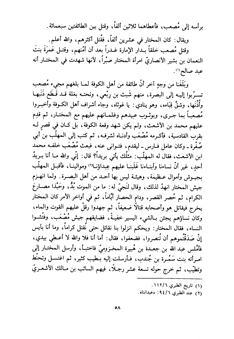 وَبَلَغَنَا مِنْ وَجْهٍ آخَرَ أَنَّ طَائِفَةً مِنْ أَهْلِ الْكُوفَةِ لَمَّا بَلَغَهُمْ مَجِيءُ مُصْعَبٍ تَسَرَّبُوا إِلَيْهِ إِلَى الْبَصْرَةِ، مِنْهُمْ شَبَثُ بْنُ رِبْعِيٌّ، وَتَحْتَهُ بَغْلَةٌ قَدْ قَطَعَ ذَنَبَهَا وَأُذُنَهَا، وَشَقَّ قِبَاءَهُ، وَهُوَ يُنَادِي: يَا غَوْثَاهْ، وَجَاءَ أَشْرَافُ أَهْلِ الْكُوفَةِ وَأَخْبَرُوا مُصْعَبًا بِمَا جَرَى، وَبِوُثُوبِ عَبِيدُهُمْ وَغُلْمَانُهُمْ عَلَيْهِمْ مَعَ الْمُخْتَارِ، ثُمَّ قَدِمَ عَلَيْهِمْ مُحَمَّدُ بْنُ الْأَشْعَثِ، وَلَمْ يَكُنْ شَهِدَ وَقْعَةَ الْكُوفَةِ، بَلْ كَانَ فِي قَصْرٍ لَهُ بِقُرْبِ الْقَادِسِيَّةِ، فَأَكْرَمَهُ مصعب وأدناه لِشَرَفِهِ، ثُمَّ كَتَبَ إِلَى الْمُهَلَّبِ بْنِ أَبِي صُفْرَةَ- وَكَانَ عَامِلُ فَارِسٍ- لِيَقْدُمَ، فَتَوَانَى عَنْهُ، فبعث مصعب خلفه محمد ابن الْأَشْعَثِ، فَقَالَ لَهُ الْمُهَلَّبُ: مِثْلُكَ يَأْتِي بَرِيدًا؟ قَالَ: إِنِّي وَاللَّهِ مَا أَنَا بَرِيدُ أَحَدٍ، غَيْرَ أَنَّ نِسَاءَنَا وَأَبْنَاءَنَا غَلَبَنَا عَلَيْهِمْ عِبْدَاؤُنَا [2] وَمَوَالِينَا، فَأَقْبَلَ الْمُهَلَّبُ بِجُيُوشٍ وَأَمْوَالٍ عَظِيمَةٍ، وَهَيْئَةٍ لَيْسَ بِهَا أَحَدٌ مِنْ أَهْلِ الْبَصْرَةِ. وَلَمَّا انْهَزَمَ جَيْشُ الْمُخْتَارِ انْهَدَّ لِذَلِكَ، وَقَالَ لِنَجِيٍّ لَهُ: مَا مِنَ الْمَوْتِ بُدٌّ، وَحَبَّذَا مَصَارِعَ الْكِرَامِ، ثُمَّ حُصِرَ الْقَصْرُ، وَدَامَ الْحِصَارُ أَيَّامًا، ثُمَّ فِي أَوَاخِرِ الْأَمْرِ كَانَ الْمُخْتَارُ يَخْرُجُ فَيُقَاتِلُ هُوَ وَأَصْحَابُهُ قِتَالًا ضَعِيفًا، ثُمَّ جَهَدُوا وَقَلَّ عَلَيْهِمُ الْقُوتُ وَالْمَاءُ، وَكَانَ نِسَاؤُهُمْ يَجِئْنَ بِالشَّيْءِ الْيَسِيرِ خِفْيَةً، فَضَايَقَهُمْ جَيْشُ مُصْعَبٍ، وَفتَّشُوا النِّسَاءَ، فَقَالَ الْمُخْتَارُ: وَيْحَكُمُ انْزِلُوا بِنَا نُقَاتِلُ حَتَّى نُقْتَلَ كِرَامًا، وَمَا أَنَا بِآيِسٍ إِنْ صَدَقْتُمُوهُمْ أَنْ تُنْصَرُوا، فَضَعُفُوا، فَقَالَ: أَمَّا أَنَا فَلَا وَاللَّهِ لَا أُعْطِي بِيَدِي، فَأَمَّلَسَ عَبْدُ اللَّهِ بْنُ جَعْدَةَ بْنِ هُبَيْرَةَ الْمَخْزُومِيُّ فَاخْتَبَأَ، وَأَرْسَلَ الْمُخْتَارُ إِلَى امْرَأَتِهِ بِنْتِ سَمُرَةَ بْنِ جُنْدُبٍ، فَأَرْسَلَتْ إِلَيْهِ بِطِيبٍ كَثِيرٍ، ثُمَّ اغْتَسَلَ وَتَحَنَّطَ وَتَطَيَّبَ، ثُمَّ خَرَجَ حَوْلَهُ تِسْعَةَ عَشَرَ رجلا، فيهم السائب بن مالك الأشعريّ