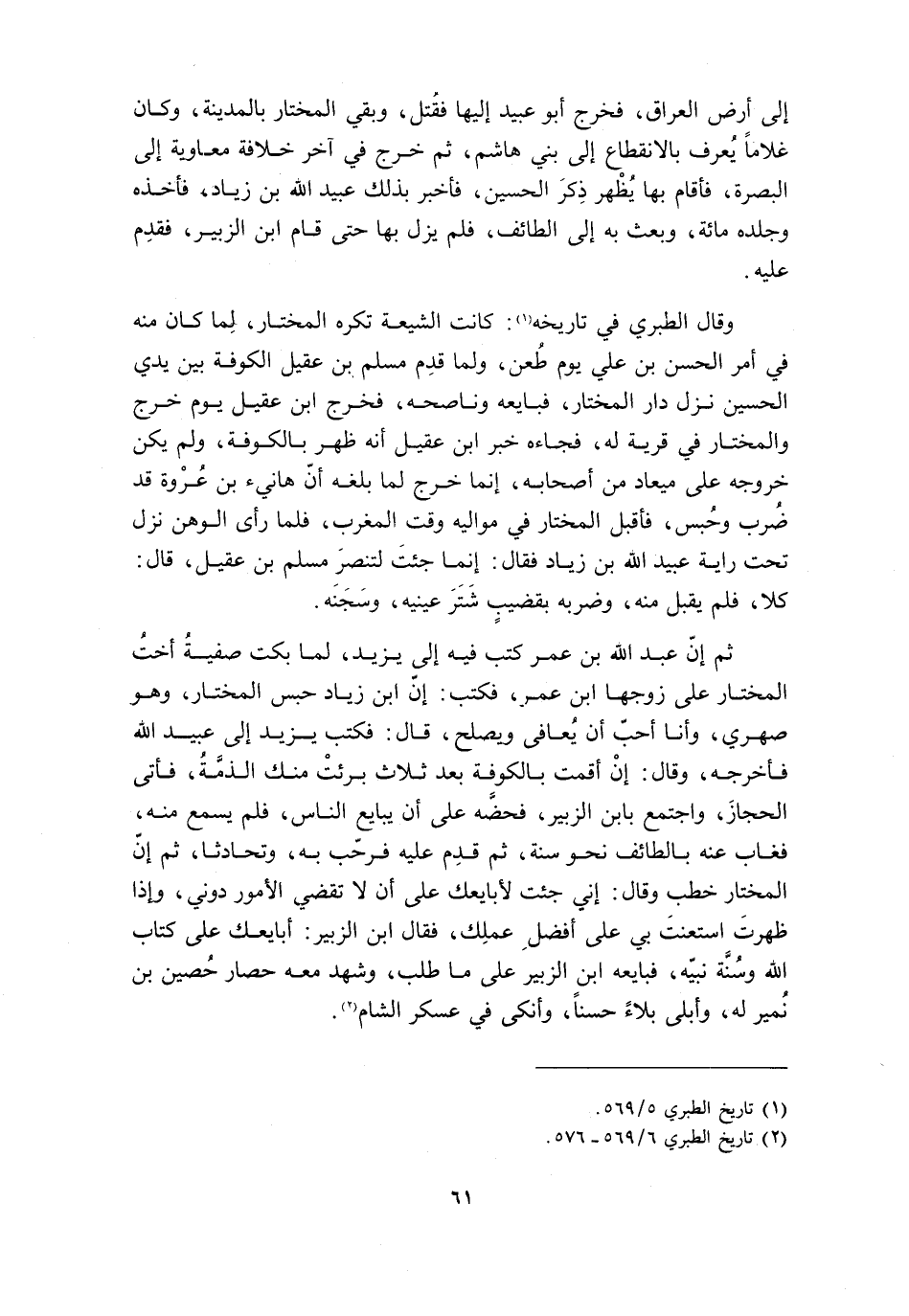إِلَى أَرْضِ الْعِرَاقِ، فَخَرَجَ أَبُو عُبَيْدٍ إِلَيْهِا فَقُتِلَ، وَبَقِيَ الْمُخْتَارُ بِالْمَدِينَةِ، وَكَانَ غُلَامًا يُعْرَفُ بِالِانْقِطَاعِ إِلَى بَنِي هَاشِمٍ، ثُمَّ خَرَجَ فِي آخِرِ خِلَافَةِ مُعَاوِيَةَ إِلَى الْبَصْرَةِ، فَأَقَامَ بِهَا يُظْهَرُ ذِكْرَ الْحُسَيْنِ، فَأَخْبَرَ بِذَلِكَ عُبَيْدَ اللَّهِ بْنَ زِيَادٍ، فَأَخَذَهُ وَجَلَدَهُ مِائَةً، وَبَعَثَ بِهِ إِلَى الطَّائِفِ، فَلَمْ يَزَلْ بِهَا حَتَّى قَامَ ابْنُ الزُّبَيْرِ، فَقَدِمَ عَلَيْهِ.