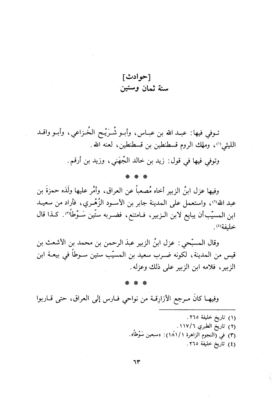 وَفِيهَا عَزَلَ ابْنُ الزُّبْيَرِ أَخَاهُ مُصْعَبًا عَنِ الْعِرَاقِ، وَأَمَّرَ عَلَيْهَا وَلَدَه حَمْزَةَ بْنَ عَبْدِ اللَّهِ [2] ، وَاسْتَعْمَلَ عَلَى الْمَدِينَةِ جَابِرَ بْنَ الْأَسْوَدِ الزُّهْرِيَّ، فأراد من سعيد ابن الْمُسَيِّبِ أَنْ يُبَايِعَ لِابْنِ الزُّبَيْرِ، فَامْتَنَعَ، فَضَرَبَهُ سِتِّينَ سَوْطًا [3] . كَذَا قَالَ خَلِيفَةُ [4] .