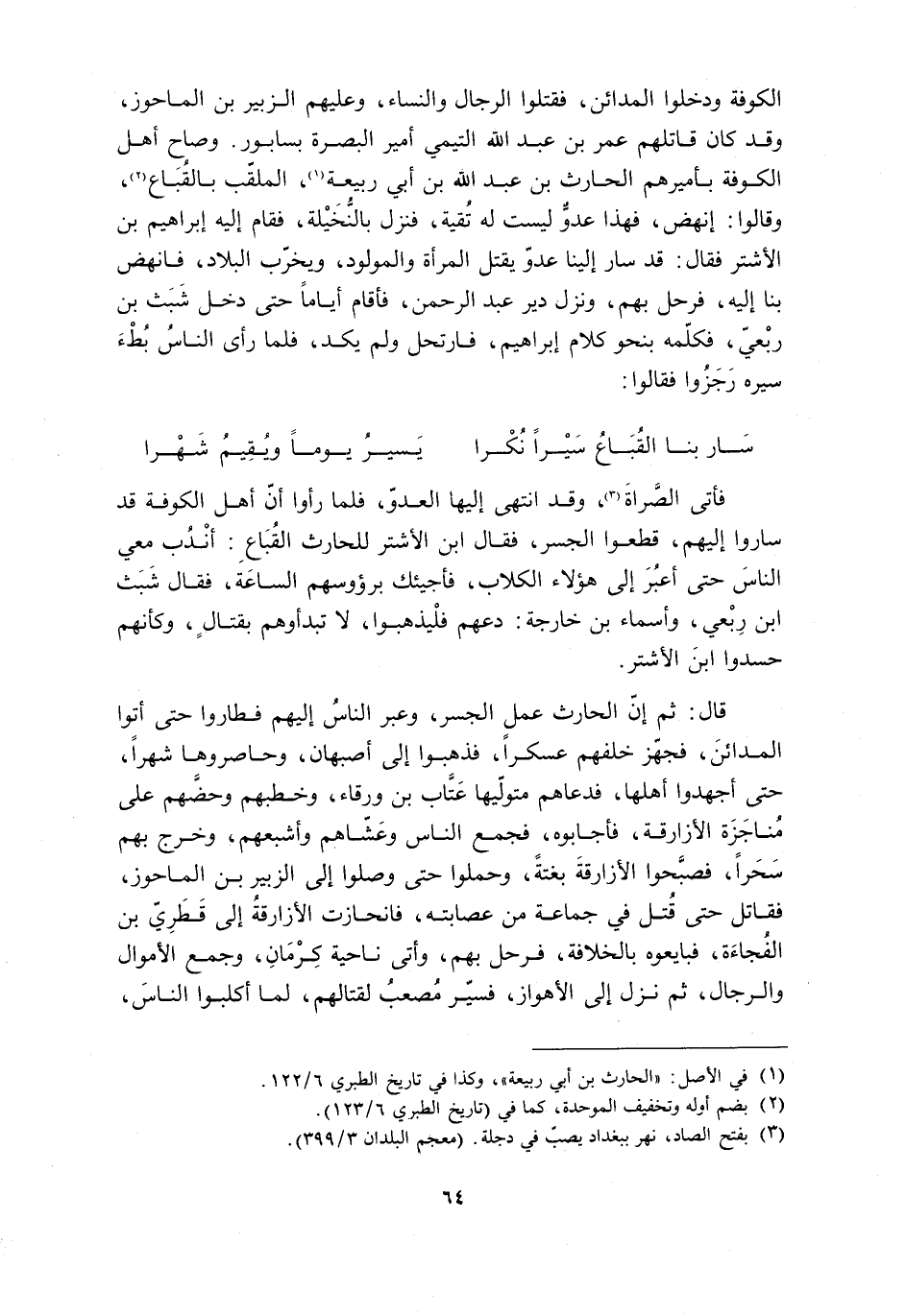 الْكُوفَةَ وَدَخَلُوا الْمَدَائِنَ، فَقَتَلُوا الرِّجَالَ وَالنِّسَاءَ، وَعَلَيْهِمُ الزُّبَيْرُ بْنُ الْمَاحُوزِ، وَقَدْ كَانَ قَاتَلَهُمْ عُمَرُ بْنُ عَبْدِ اللَّهِ التَّيْمِيُّ أَمِيرُ الْبَصْرَةِ بِسَابُورَ. وَصَاحَ أَهْلُ الْكُوفَةِ بِأَمِيرِهِمُ الْحَارِثِ بْنِ عَبْدِ اللَّهِ بْنِ أَبِي رَبِيعَةَ [1] ، الْمُلَقَّبُ بِالْقُبَاعِ [2] ، وَقَالُوا: انْهَضْ، فَهَذَا عَدُوٌّ لَيْسَتْ لَهُ تُقْيَةٌ، فَنَزَلَ بِالنُّخَيْلَةِ، فَقَامَ إِلَيْهِ إِبْرَاهِيمُ بْنُ الْأَشْتَرِ فَقَالَ: قَدْ سَارَ إِلَيْنَا عَدُوٌّ يَقْتُلُ الْمَرْأَةَ وَالْمَوْلُودَ، وَيُخَرِّبُ الْبِلَادَ، فَانْهَضْ بِنَا إِلَيْهِ، فَرَحَلَ بِهِمْ، وَنَزَلَ دَيْرَ عَبْدِ الرَّحْمَنِ، فَأَقَامَ أَيَّامًا حَتَّى دَخَلَ شَبَثُ بْنُ رِبعِيُّ، فَكَلَّمَهُ بِنَحْوِ كَلَامِ إِبْرَاهِيمَ، فَارْتَحَلَ وَلَمْ يَكَدْ، فَلَمَّا رَأَى النَّاسُ بُطْءَ سَيْرِهِ رَجَزُوا فَقَالُوا: